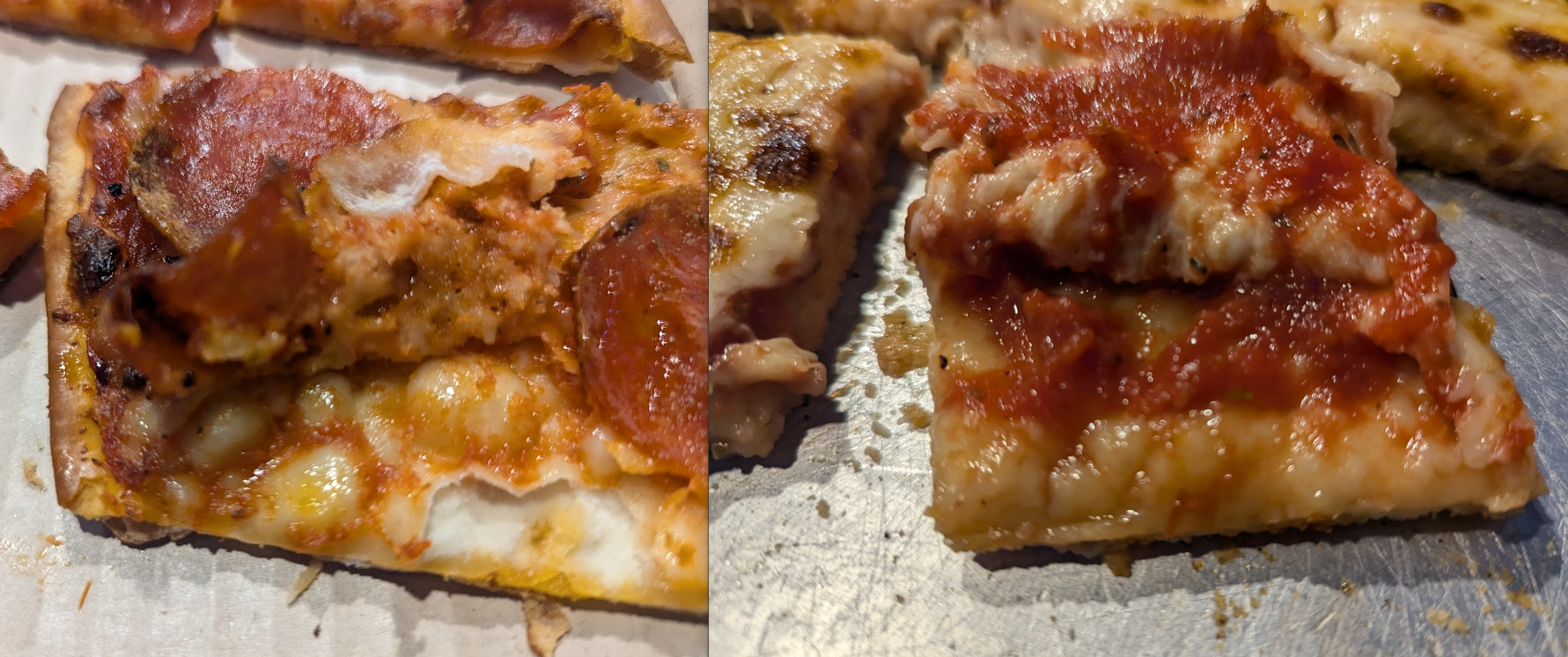 Pizza Hut’s is also crispy, so credit goes where credit is due. That said, Da Sauce has a touch of chew inside of it and a fresh, doughy flavor – the dough is made from scratch daily. Pizza Hut’s crust was very thin but also bland – like thin, crisp cardboard.