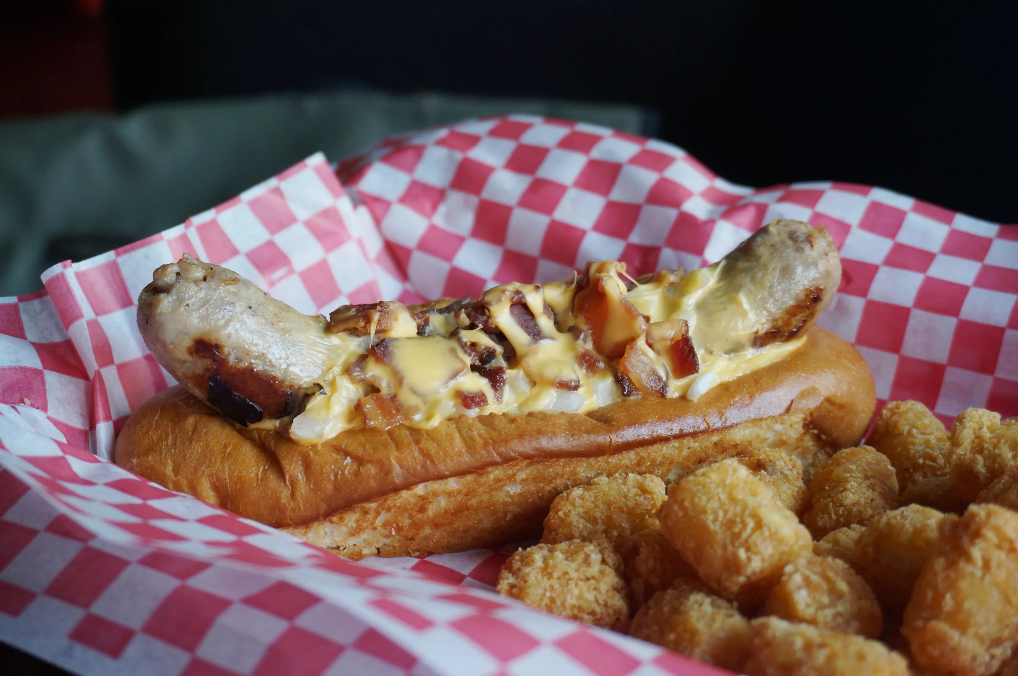 Bacon and cheese sauce shroud a housemade bratwurst.