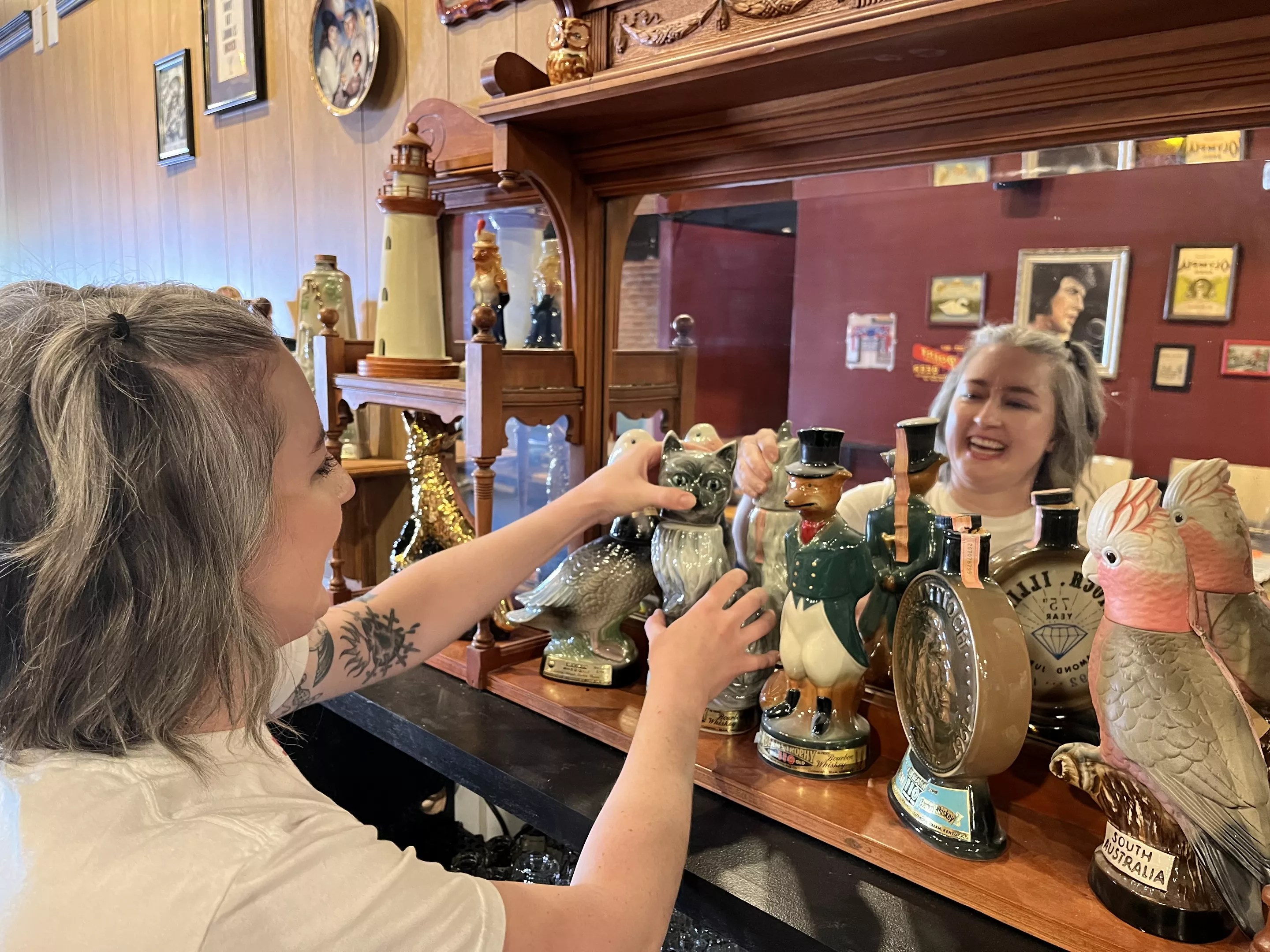 The kitschy basement decor includes a bunch of quirky collectible ceramic whiskey decanters.
