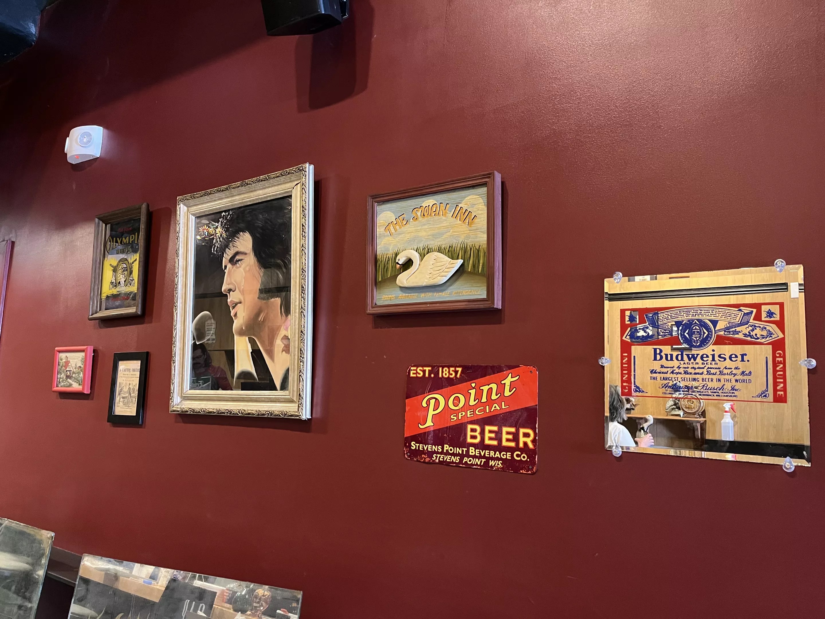 The team delivered on the basement theme. Each wood-panel covered wall has weird thrift store finds, including a collection of beer-themed mirror frames, a cross stitch, an E.T.-themed Coors ad, and a large framed painting of a teary Elvis Presley.