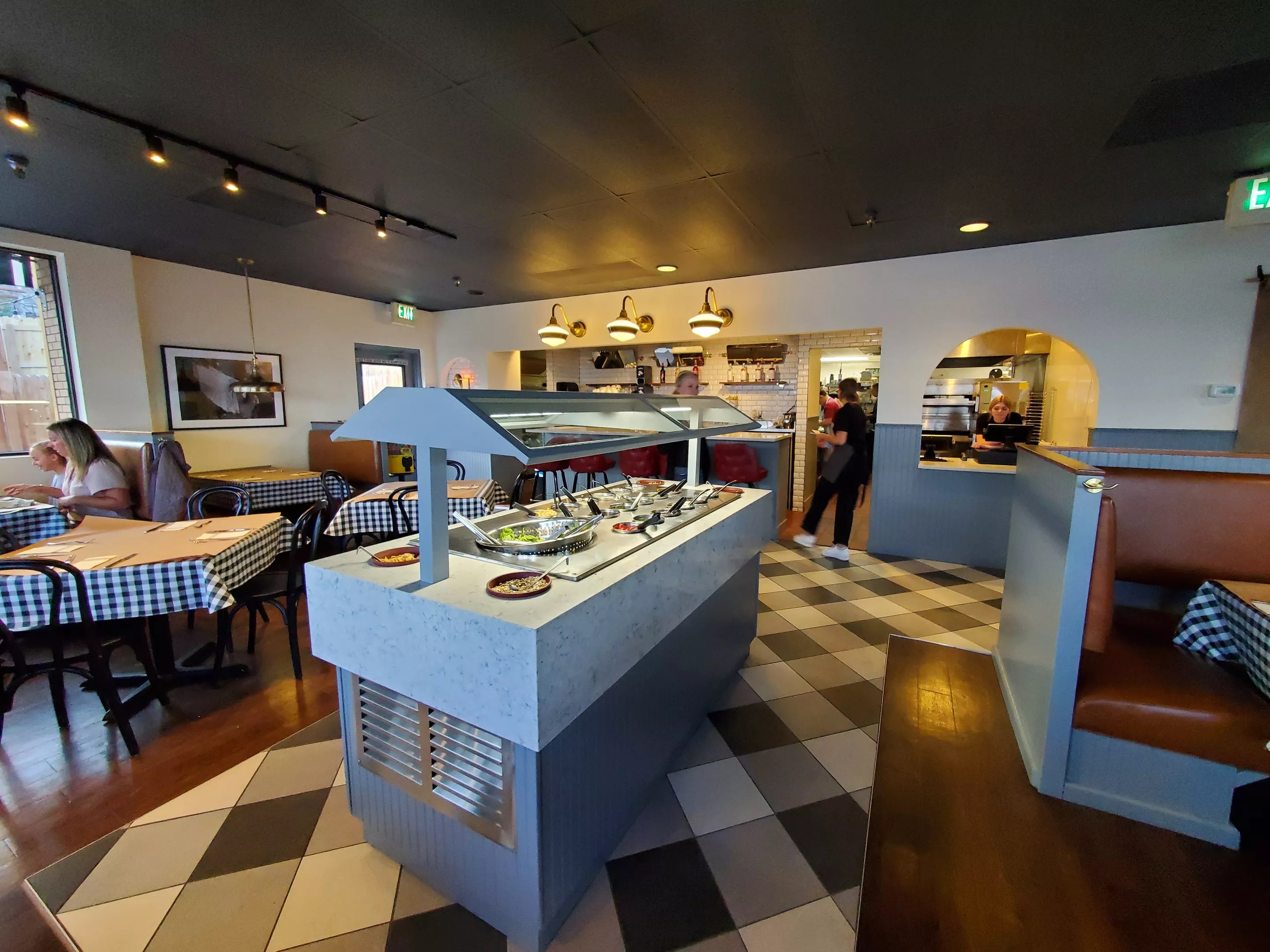 Roca’s still feels like a neighborhood joint, albeit a cleaned-up version of its previous iteration. The design is simple with wood floors; a few large, brown booths; black-and-white checkered tablecloths and a simple salad bar in the middle of one of the dining areas. It’s like a modern, more monochrome take on the vibes of an old-school Pizza Hut, back when those were full-service restaurants – although there are no big, translucent red cups.