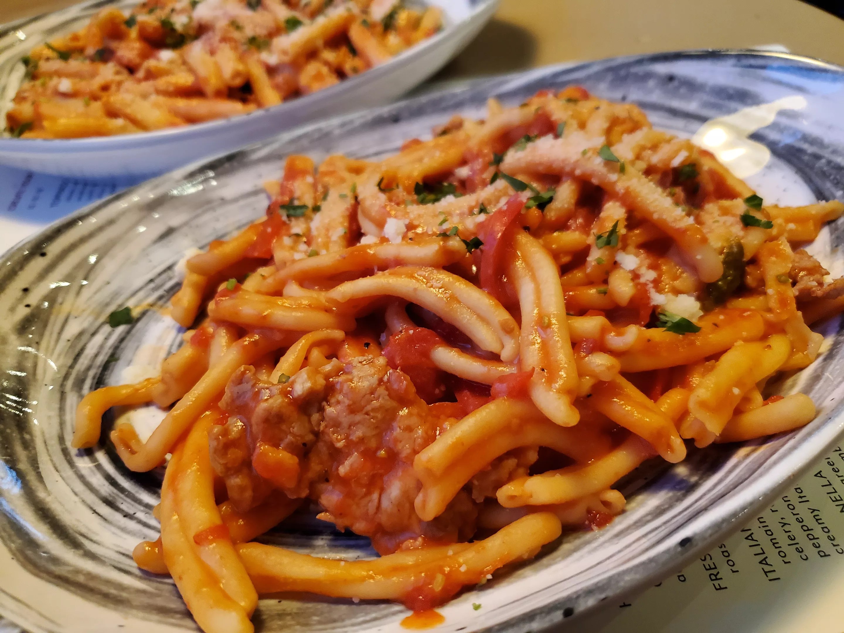Many of the waitstaff are high-schoolers – some served their first tables ever during this preview – but even if they’re still learning, they were eager to help with any request. Sure, a few items took a while to find their way to the right tables, and one glass of pinot never made it at all, but for its first service, Roca’s was buzzing as thin, tavern-style pies, thicker Sicilian pizzas and a while lot of pasta was pumped out of the kitchen.