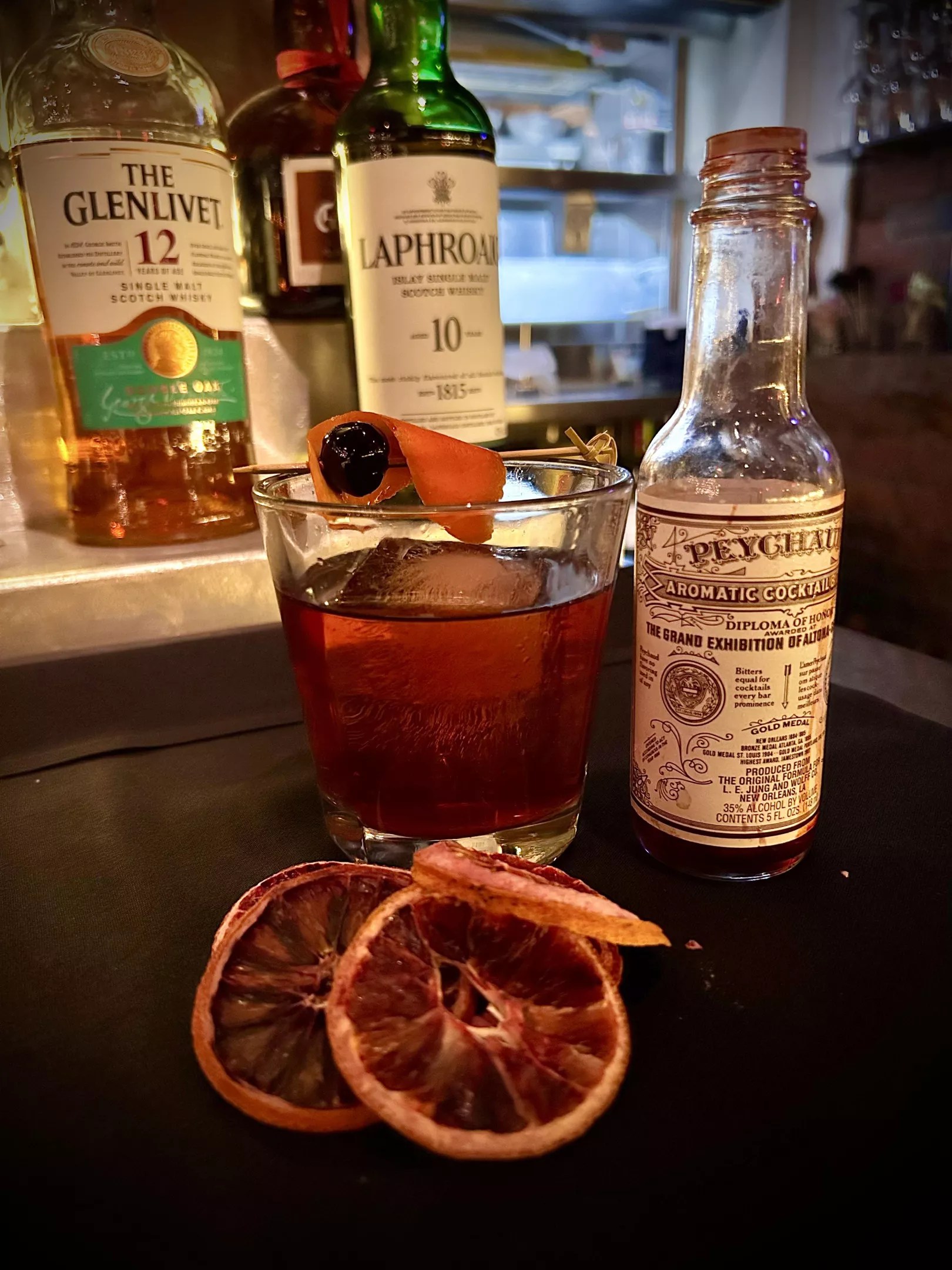 Stir on ice and strain onto a big cube. Garnish with a cherry and an orange twist.