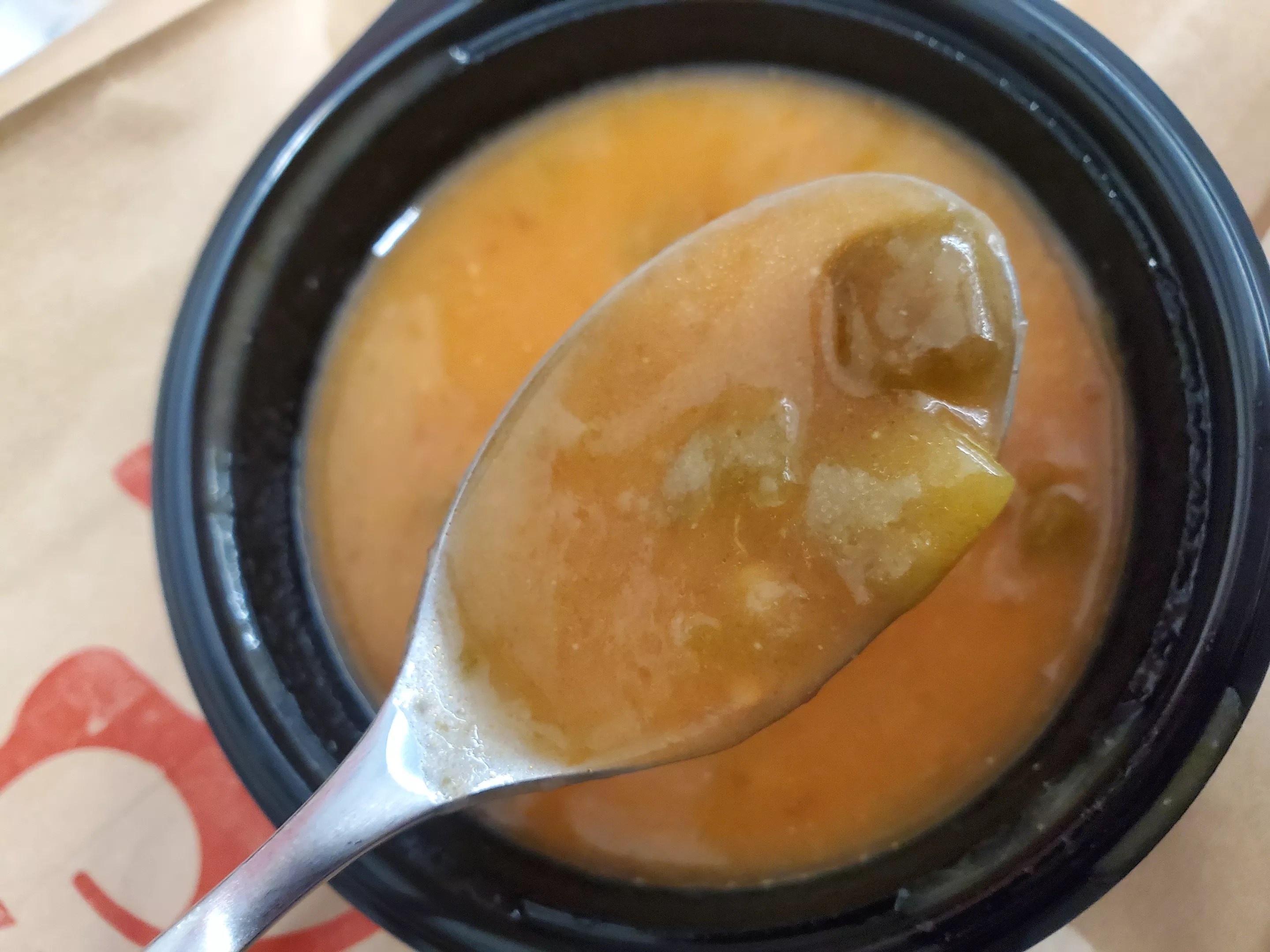 This time, my half-and-half order had hardly any noticeable heat. Chiles can vary from year to year and season to season, so that’s not a deal-breaker on its own. But this was also severely under-seasoned, and its texture was unappealing – most of my favorite versions of green chile are either thick and gravy-like or eat more like a stew, but this one came across as more soupy, and not in a good way. I felt like I could taste the flour in it, as well, as if it hadn’t been cooked off long enough.