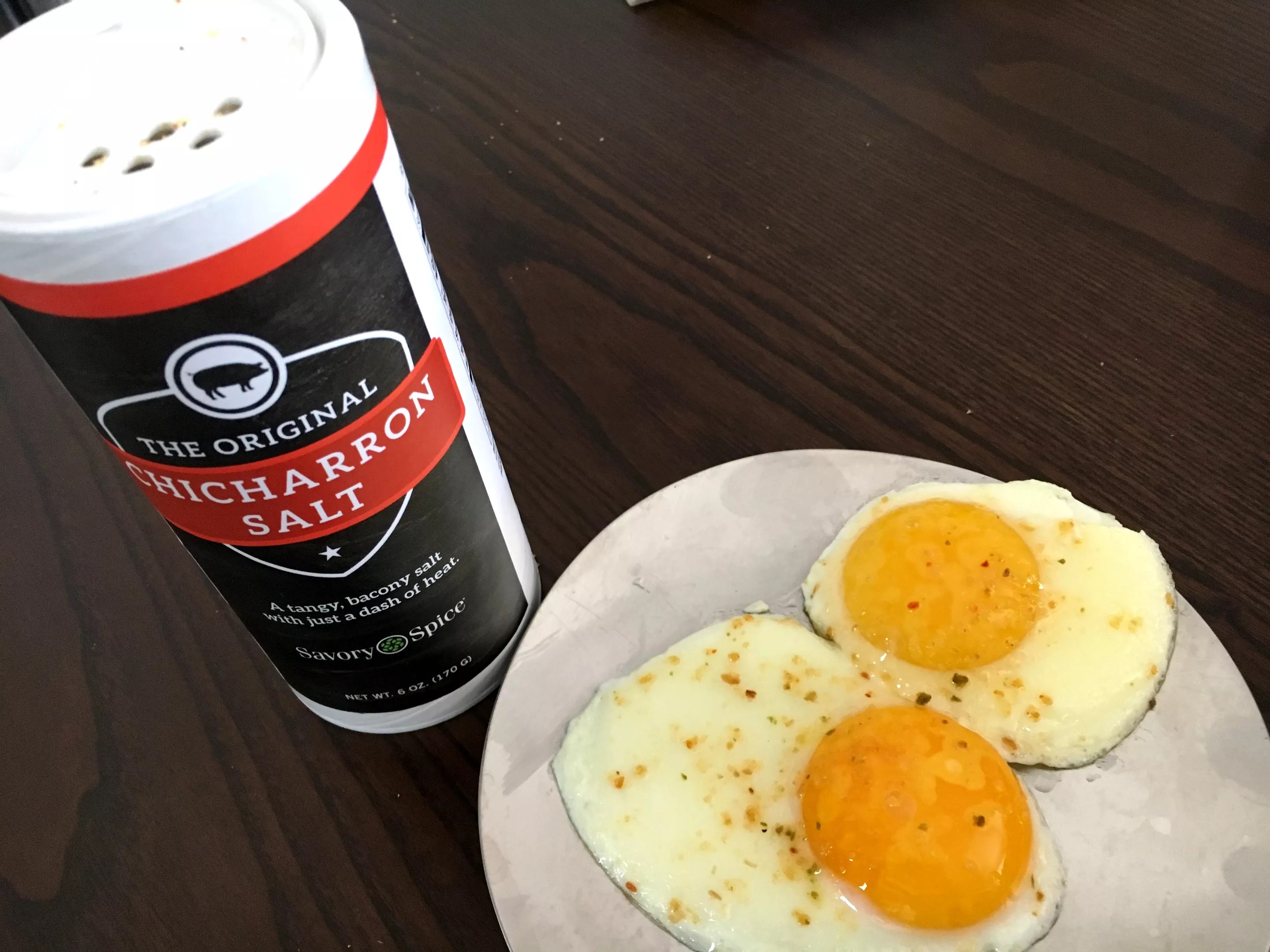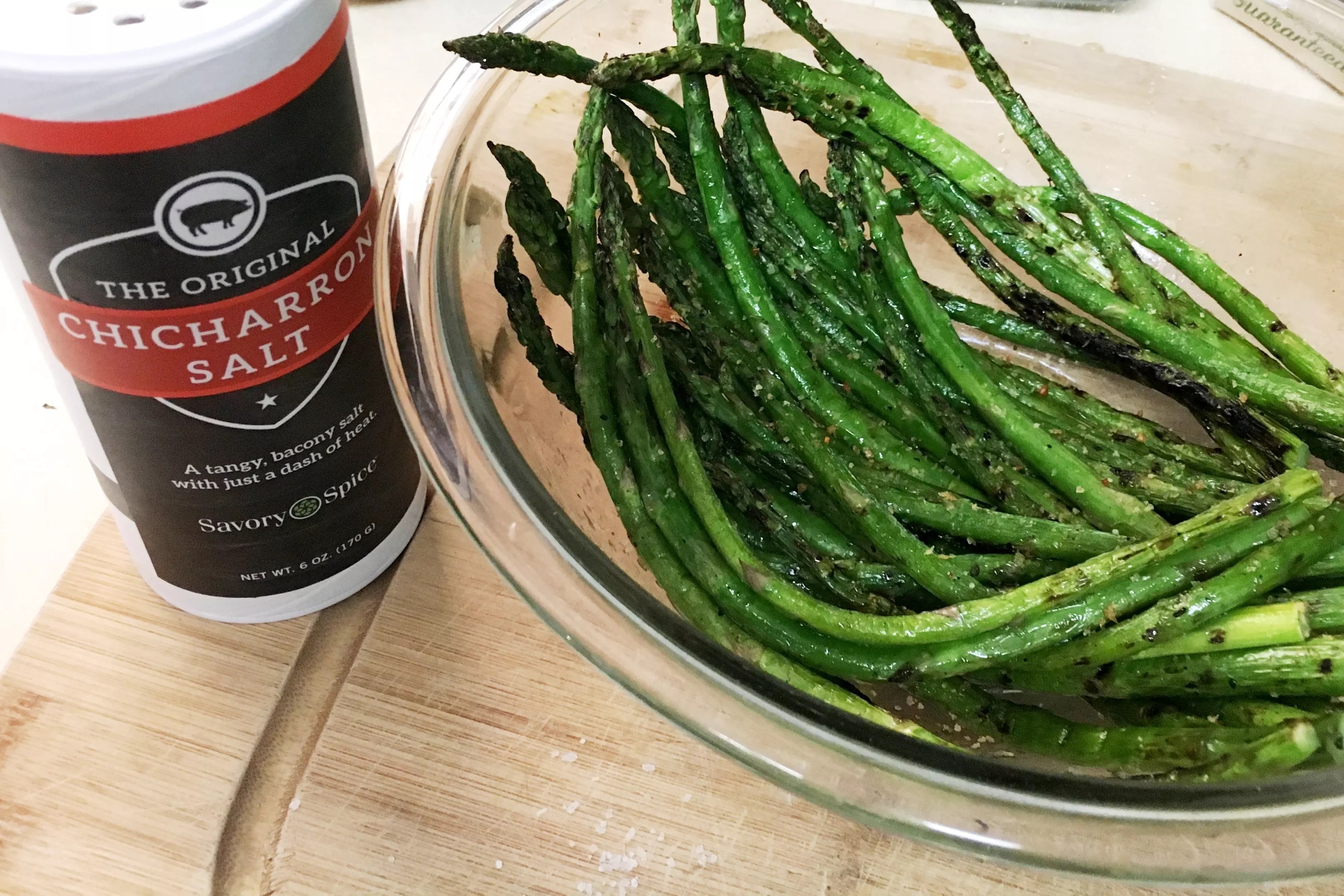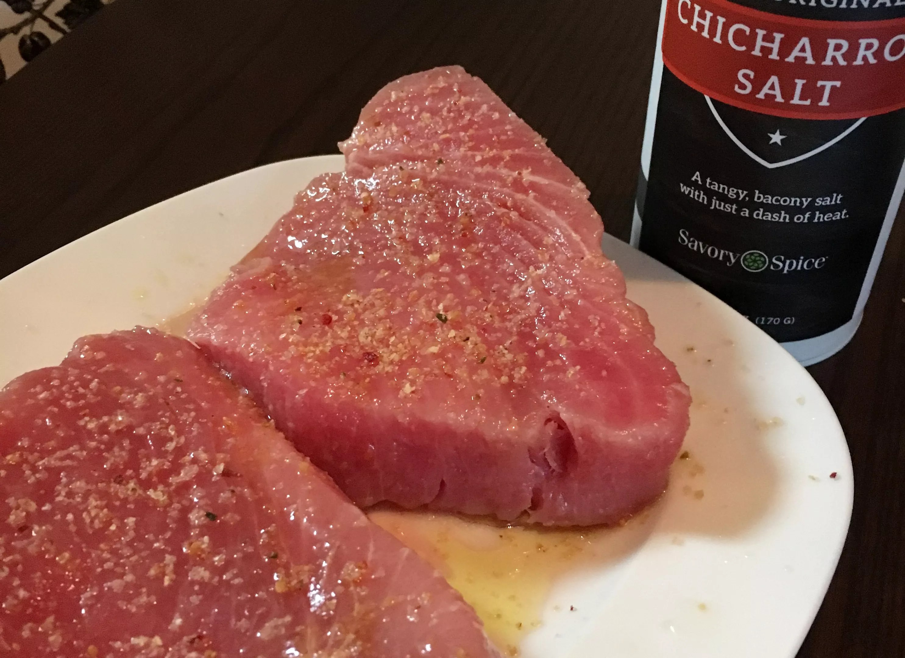 We tried Savory’s Chicharron Salt at home on a number of sweet and savory items, including ice cream (a winner), fried eggs, baked macaroni and cheese, and a margarita (on the rim). Keep reading to see a few more experiments. Grilled asparagus with olive oil, lemon juice and chicharron salt. Mark Antonation Tuna marinated with chicharron salt, lime juice and olive oil. The “porkified” tuna was then grilled to rare. Mark Antonation Fried eggs sunny-side up with chicharron salt. Mark Antonation