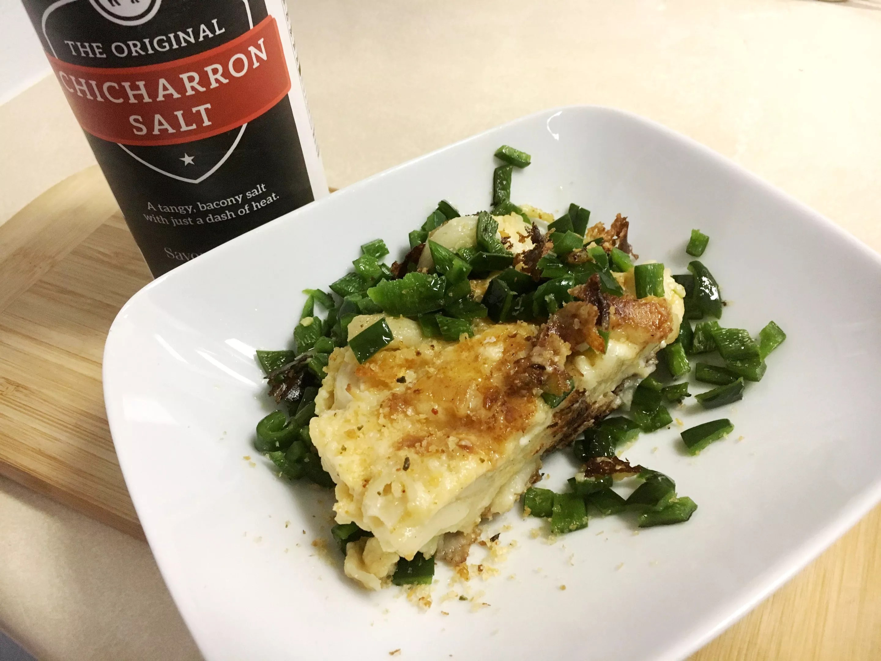 Baked macaroni and cheese with diced chiles and chicharron salt.