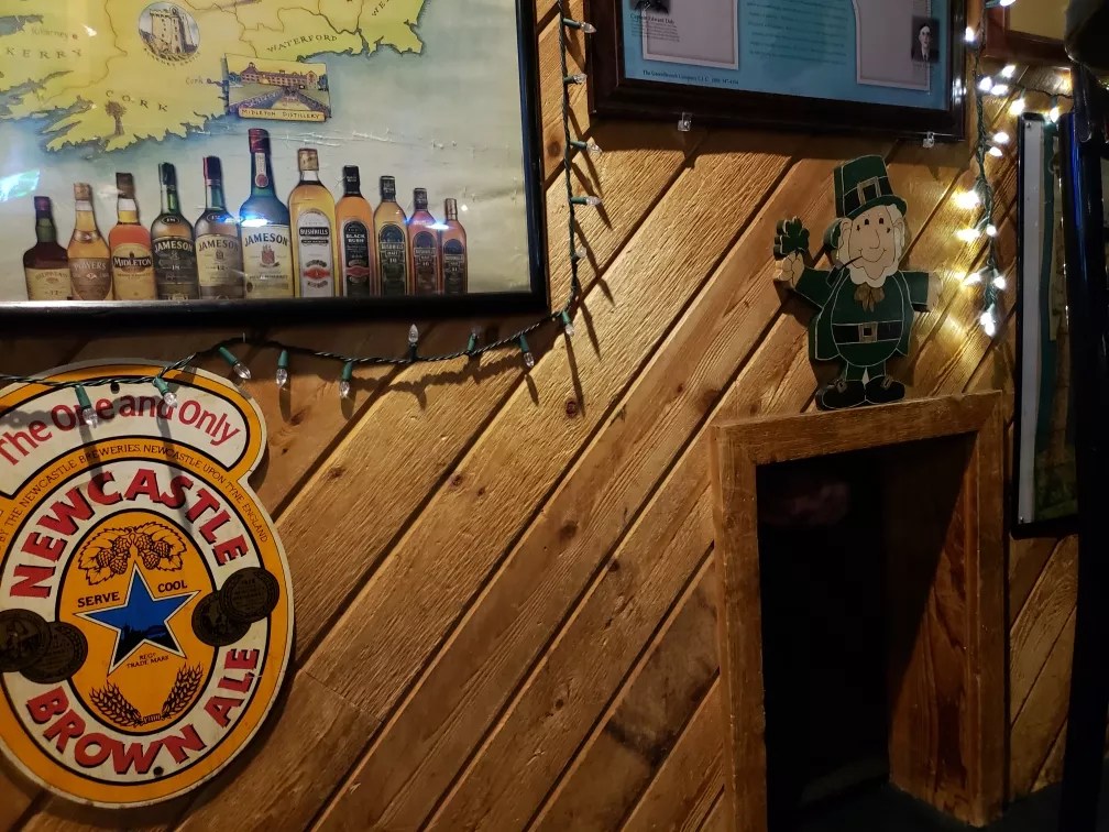 Also in keeping with the Irish theme, there is a tiny door cut near the actual front entrance. My friends and I noticed this and floated theories about what it was for. Our bartender confirmed that this door is, as we suspected, for leprechauns. I’ve been to Irish bars with traditional “snugs,” where people can drink booze in secret, and ones with murals of Irish scenes, but this was the first time I’ve ever seen a leprechaun door, and I hope it won’t be the last.