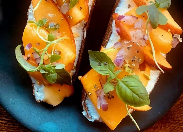 With the two types of peaches, Broening whipped up a crostini layered with housemade ricotta and micro basil, which he also found at the market. Tall Guy Tiny Greens is a stand that indeed is run by a very tall man, Eric Beck, who started the business during the pandemic. Microgreens, says Broening, are always found at a farmers’ market thanks to lauded chef Charlie Trotter, who started the trend of using these tiny sprouts on dishes back in the 1980s.