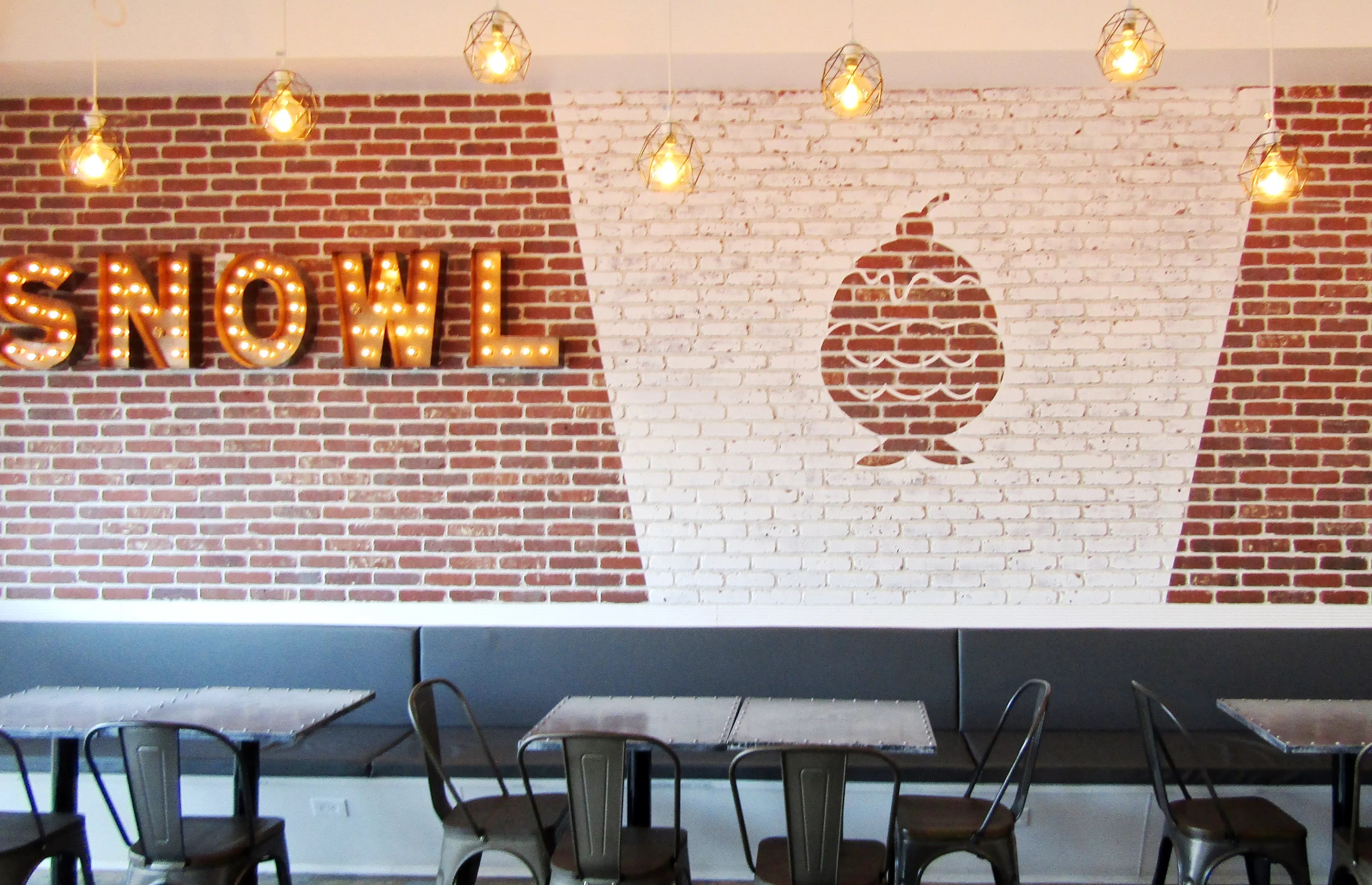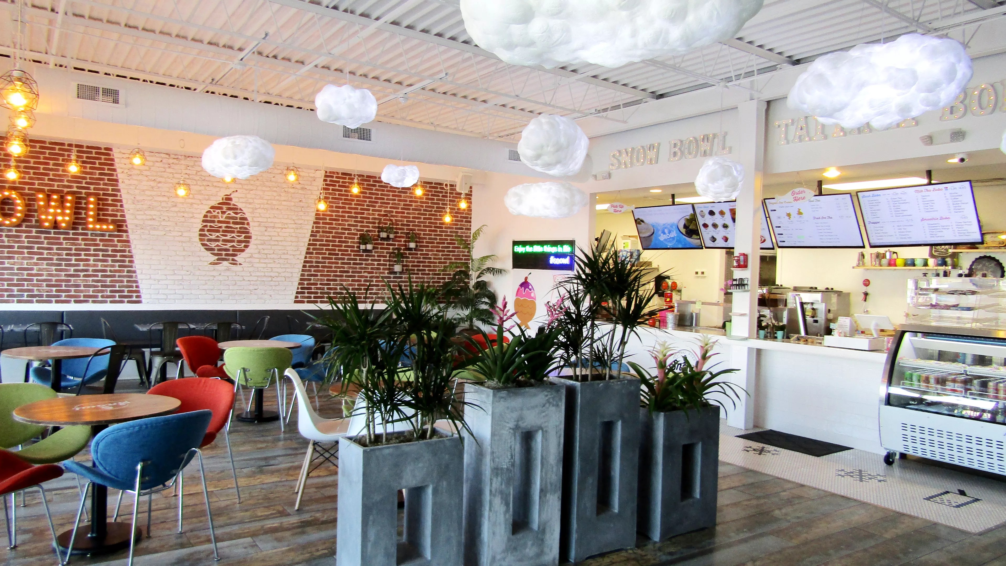 Snowl – pronounced like a portmanteau of “snow” and “bowl” (not “snow” and “owl”) – is cute in the extreme. Light fixtures shaped like fluffy clouds hang over a dining area decorated with retro lounge chairs, potted plants and neon signs with sayings scrawled in bright colors. “Enjoy the little things in life,” one of them reads. And indeed, if you can’t enjoy a crunchy waffle shaped like a goggle-eyed fish with its mouth full of Nutella and soft-serve, you might just be lacking in joy.