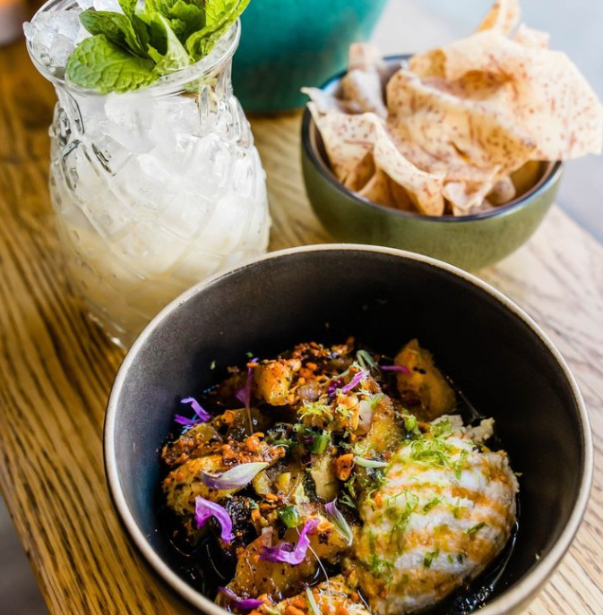 Over at LoHi’s Señor Bear, chef John DePierro has inspired a new cheese craving with his burrata with grilled squash, arbol honey, chile-chulpe crunch and lime, served with taro chips. Pair it with a paloma and give thanks for these punchy flavors.