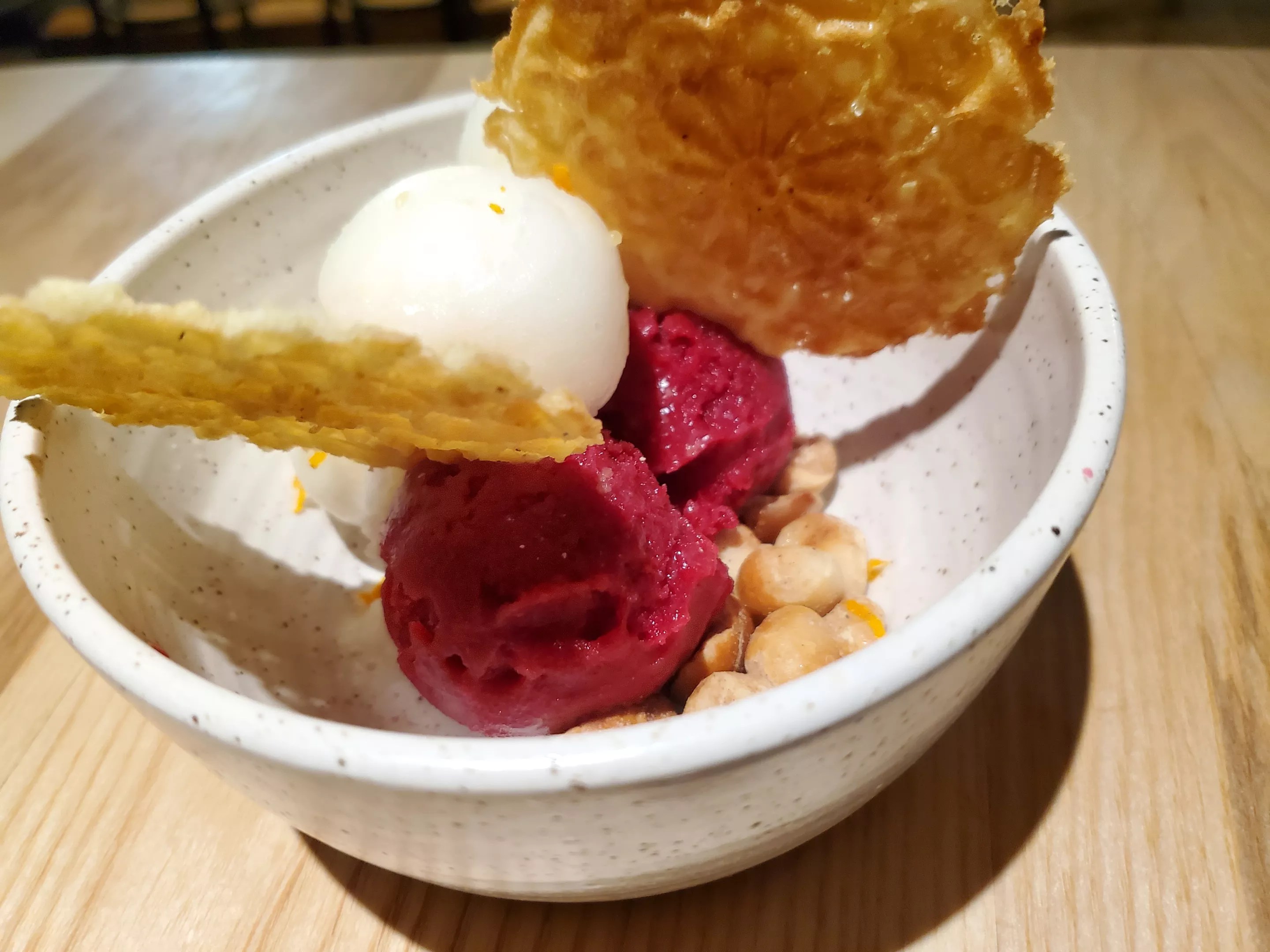 On the back of the dessert menu is a long list of aperitifs – and digestifs, if you went a little hard, as we had. But after a pause and a few sips of something to settle our stomachs, we were all in, ordering two of the six dessert options (I plan to go back for an affogato with sweet cream ice cream). For a light and refreshing option, try the Citrus Sundae ($8), which includes sorbet in two flavors – blood orange-hibiscus and Meyer lemon-thyme – that comes over crunchy toasted macadamia nuts with two citrus pizzelle cookies on top. Sour cream ice cream? Yes, please. Molly Martin