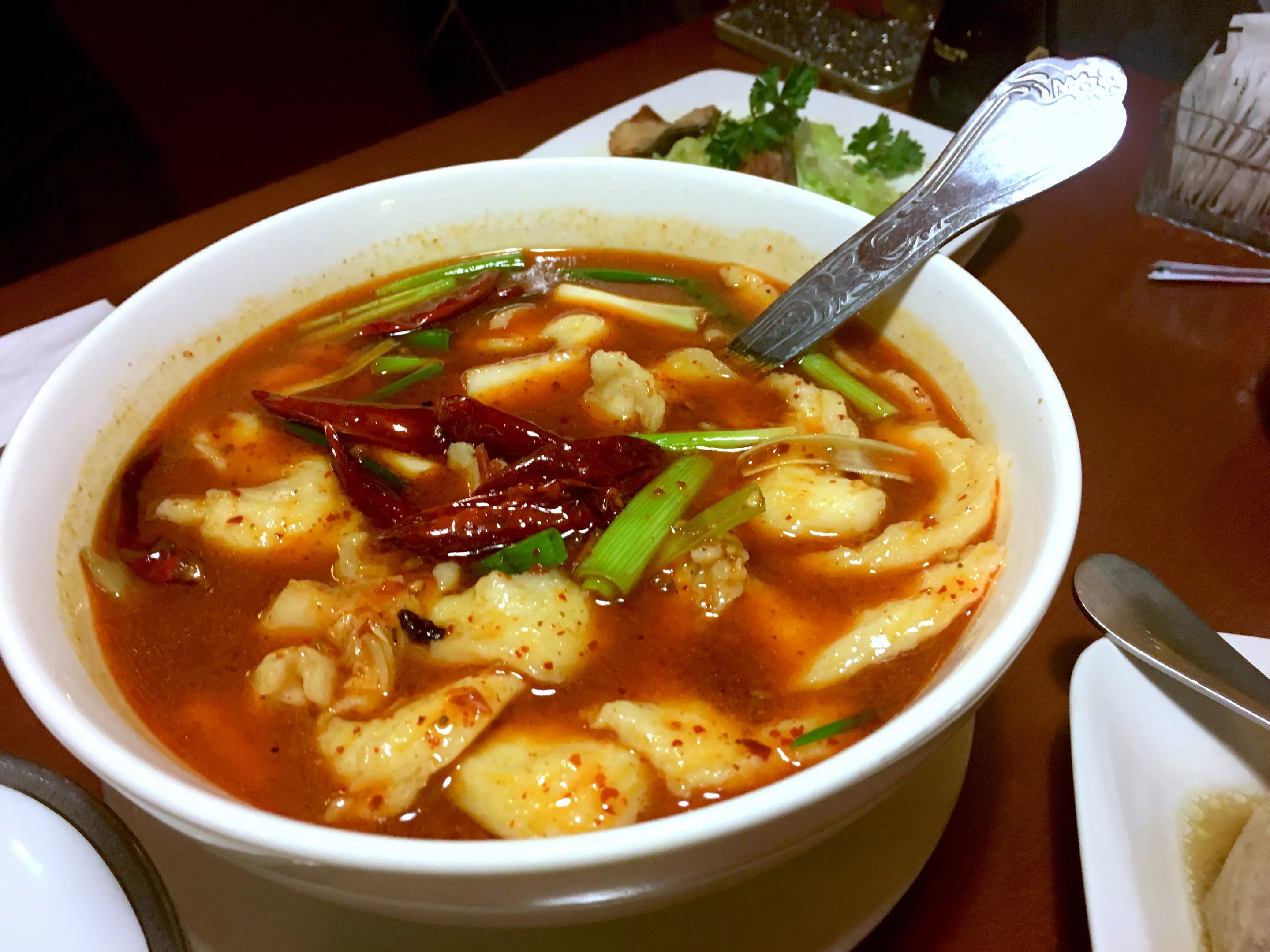 Unfortunately, I spied no squirrel fish on the menu here, but there is a sweet-and-sour fish filet, which probably closely imitates the taste, if not the presentation. You can sample several other Jiangsu specialties here, though, including Nanjing salt duck, a centuries-old recipe which requires cooks to soak and boil a whole duck with salt and herbs, eventually rendering meat that tastes almost cured. Order it at Sunflower and you’ll get half a duck, sliced and served cold, as it would be across the Pacific. You can also dip into hong shao rou (translated here as braised pork with wine), a sweet and deeply savory stewed preparation of pork belly that was – fun fact – Chairman Mao’s favorite dish. Sunflower also does a hong shao version of intestines, if you’re into offal. You’d be after the braised preparation, going by the translated menu. Supplement with the Yangzhou combo fried rice, which litters your grains with bits of seafood, Chinese sausage and peas. Heed the Sunflower staff’s call to order Sichuan specialties, like this boiled fish. Laura Shunk