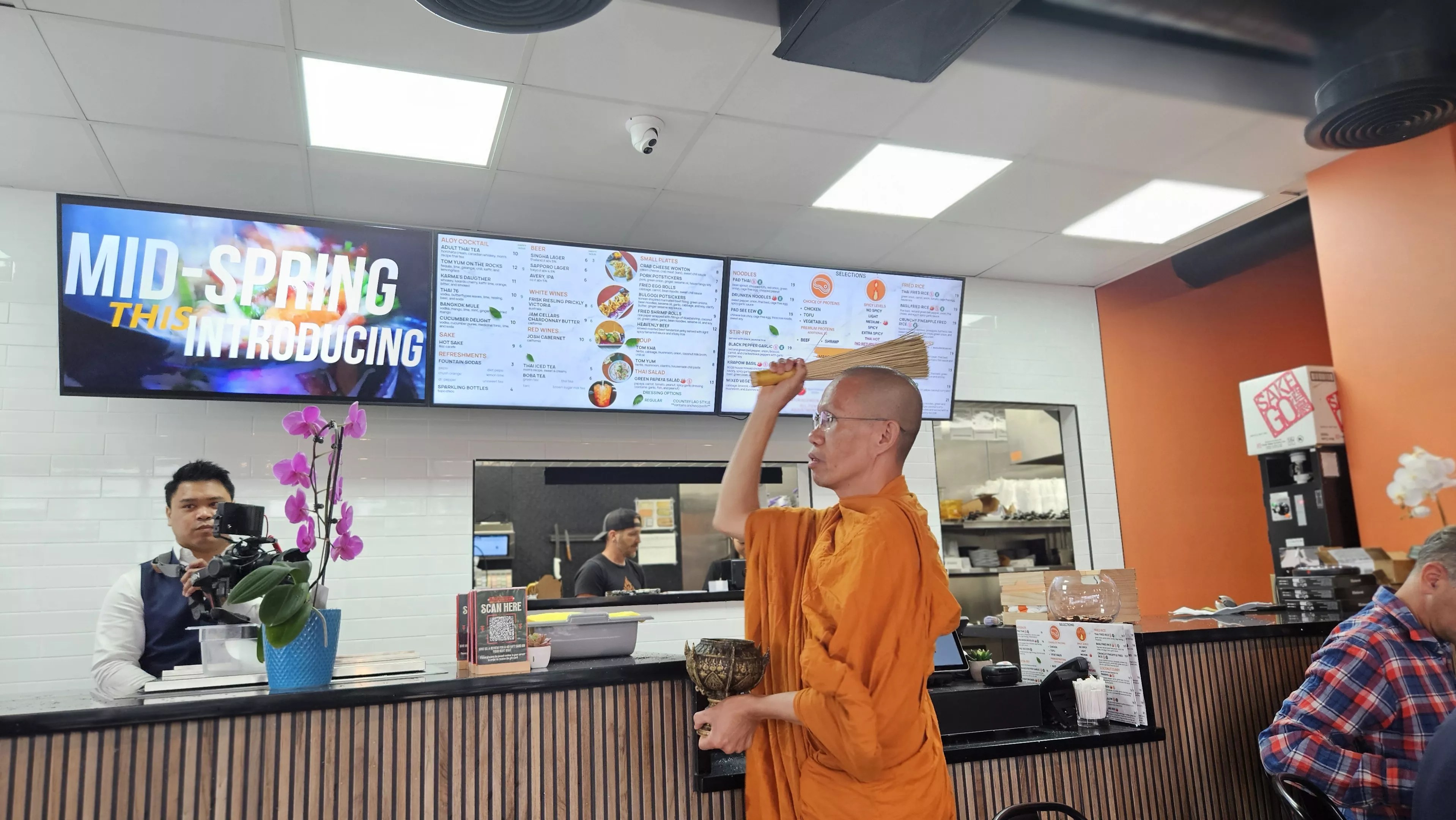 Then he stood and walked through the restaurant, spraying water a customers and the restaurant’s staff behind the counter. He also walked into the restrooms to bless them, before rejoining the other monks for the close of the ceremony.