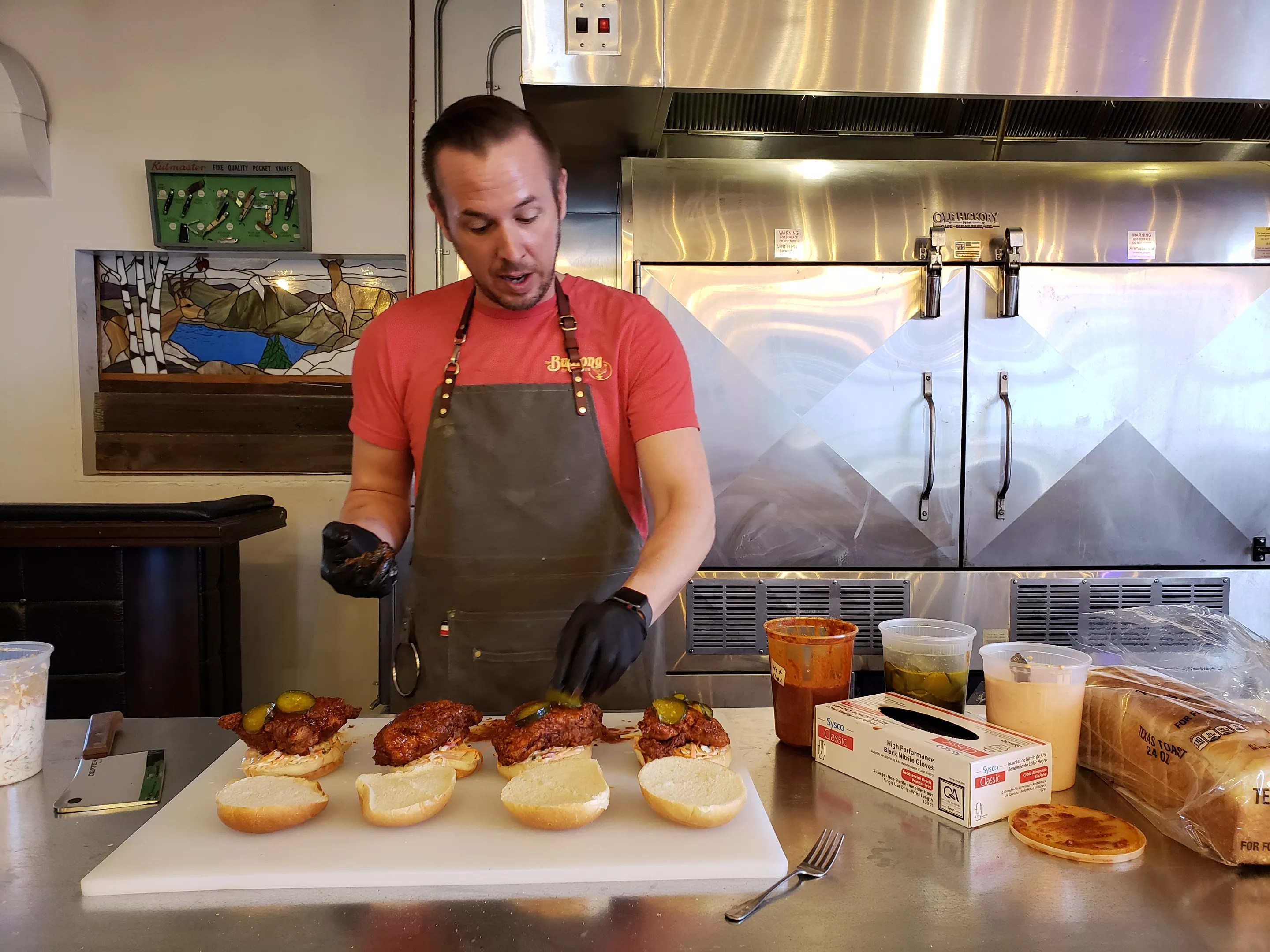 Au Feu chef/owner Jared Leonard gently dropped marinated chicken haunches into fryer oil, adding the sound of sizzling meat to the smell of wood smoke that permeated his roomy commercial kitchen in southwest Denver. Over at the counter, he spread Mississippi comeback sauce (the South’s answer to Thousand Island) on brioche buns, topped them with some farm slaw and waited to rub the hot fried chicken with his proprietary spice blend. Soon, he says, everyone will get to try his hot chicken – once the Budlong Hot Chicken truck hits the road in May. The Budlong Hot Chicken owner Jared Leonard making up hot chicken sandwiches. Linnea Covington