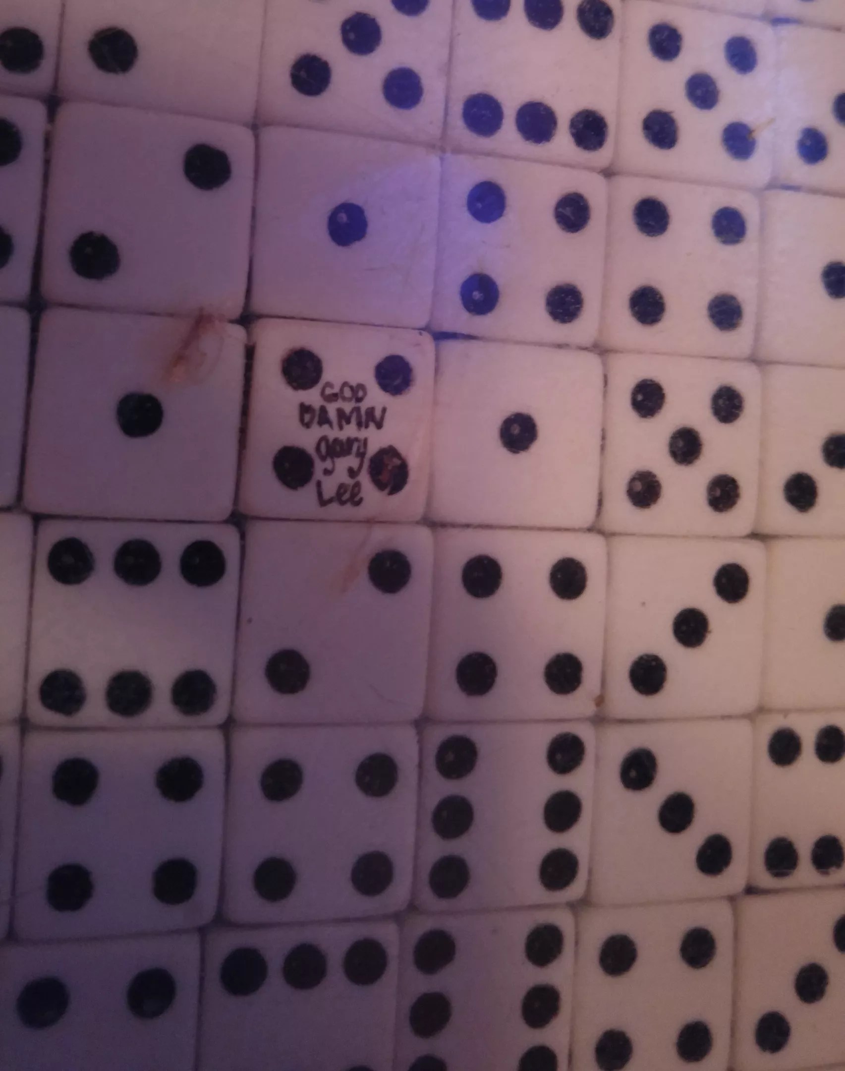 The owners of the Horseshoe have connections to another Denver bar-scene legend, the late Gary Lee Bomar, who was the proprietor of Gary Lee’s Motor Club and Grub. Before opening his own spot, Bomar worked at the Horseshoe; Unruh points out the spot on the bar, tiled with more than 24,000 dice and sealed with clear epoxy, where Bomar, who passed away in 2015, left a permanent mark. As Unruh tells it, Bomar was messing around trying to pick a dollar up off the bar with a huge kitchen knife; he ended up smashing part of the epoxy. Before fixing the damage, he wrote in tiny letters on one of the dice “God Damn Gary Lee.” The writing is still visible, sealed under new epoxy, at the end of the bar nearest the door, and serves as a sort of memorial to a man that the Denver bar and music scene misses dearly. A reminder of the late, great Gary Lee Bomar from his time working at the Horseshoe. Sarah McGill