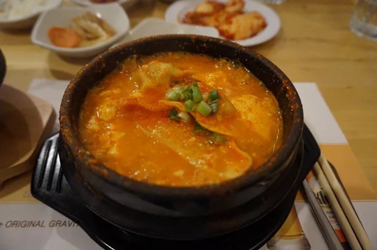 Don’t let the fact that Tofu House is a franchise put you off: This string of restaurants traces its origins to central Seoul, where the existence of multiple locations of a restaurant is an indicator of excellence. True to its name, the restaurant specializes in tofu, a custardy version of which is tucked into a dozen or so stews, mixing with oyster and clam plus mushrooms, kimchi, pork or Spam. The classic version blends the bean curd with shellfish in a spicy broth (add an egg if you’d like), and the power move here is to order it as part of a combination so that you can also sample some of Tofu House’s barbecued bulgogi, spicy pork or squid. Combination meals are built for a group, and they include a small collection of banchan – the kimchi here is exceptional – plus a small fried fish, which you can order bone-in or bone-out. Spoon your soup over japgokbap (Korean multigrain rice), and pair your meal to a bottle of makgeolli, a semi-sweet, tart fizzy rice wine that pairs nicely with spicy food. When you inevitably return to Tofu House, consider also exploring the heady oxtail soup or the cauldrons filled with rice, meat, kimchi and seaweed. They may not get marquee billing, but they’re superb offerings.