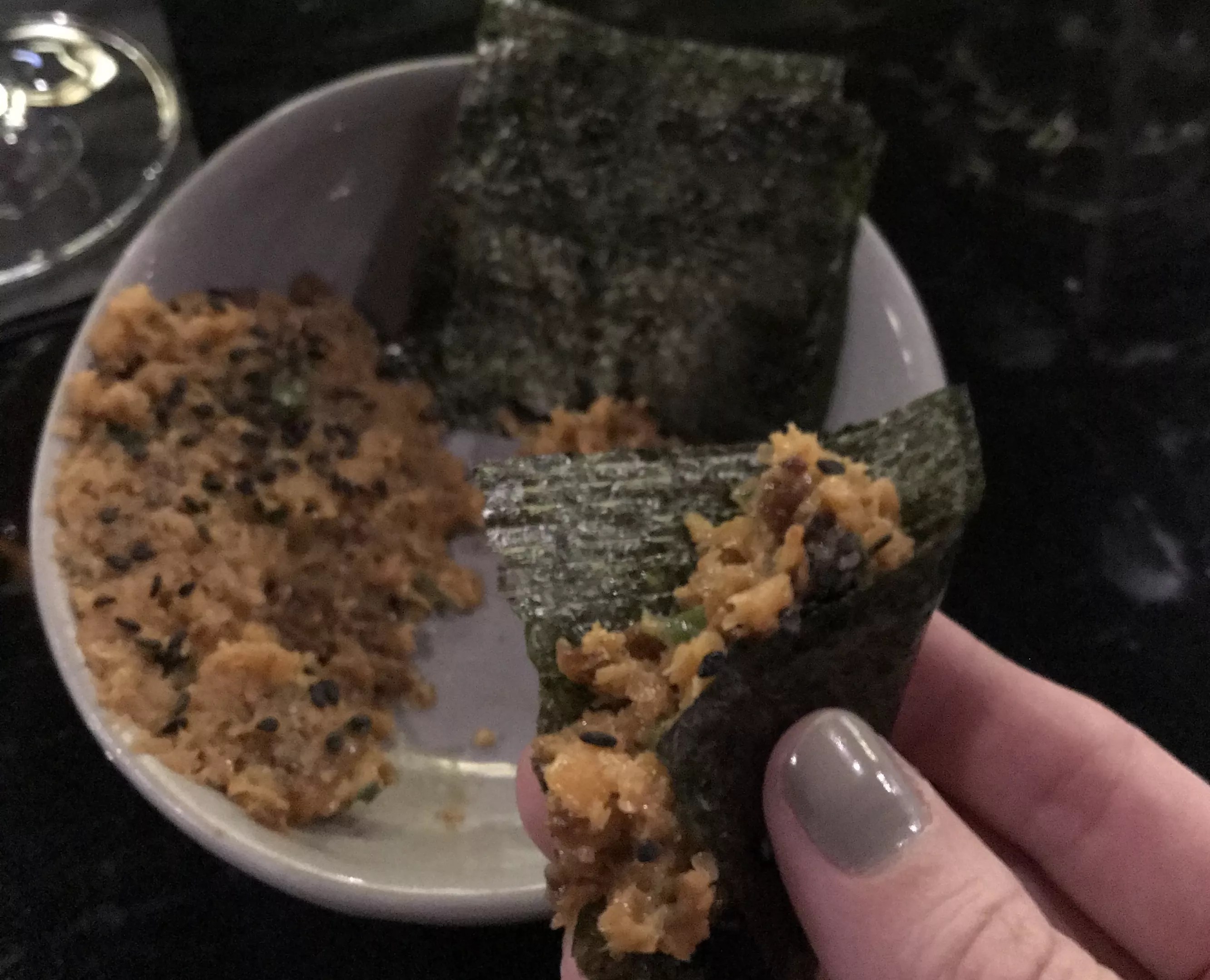 Interpretations of Asian dishes aren’t rare at the Way Back. Lavelle also serves a “sushi” appetizer that comes as nori wrappers that you fill with a spread made from ground, spiced carrots – accurately described as tasting just like a spicy tuna roll.