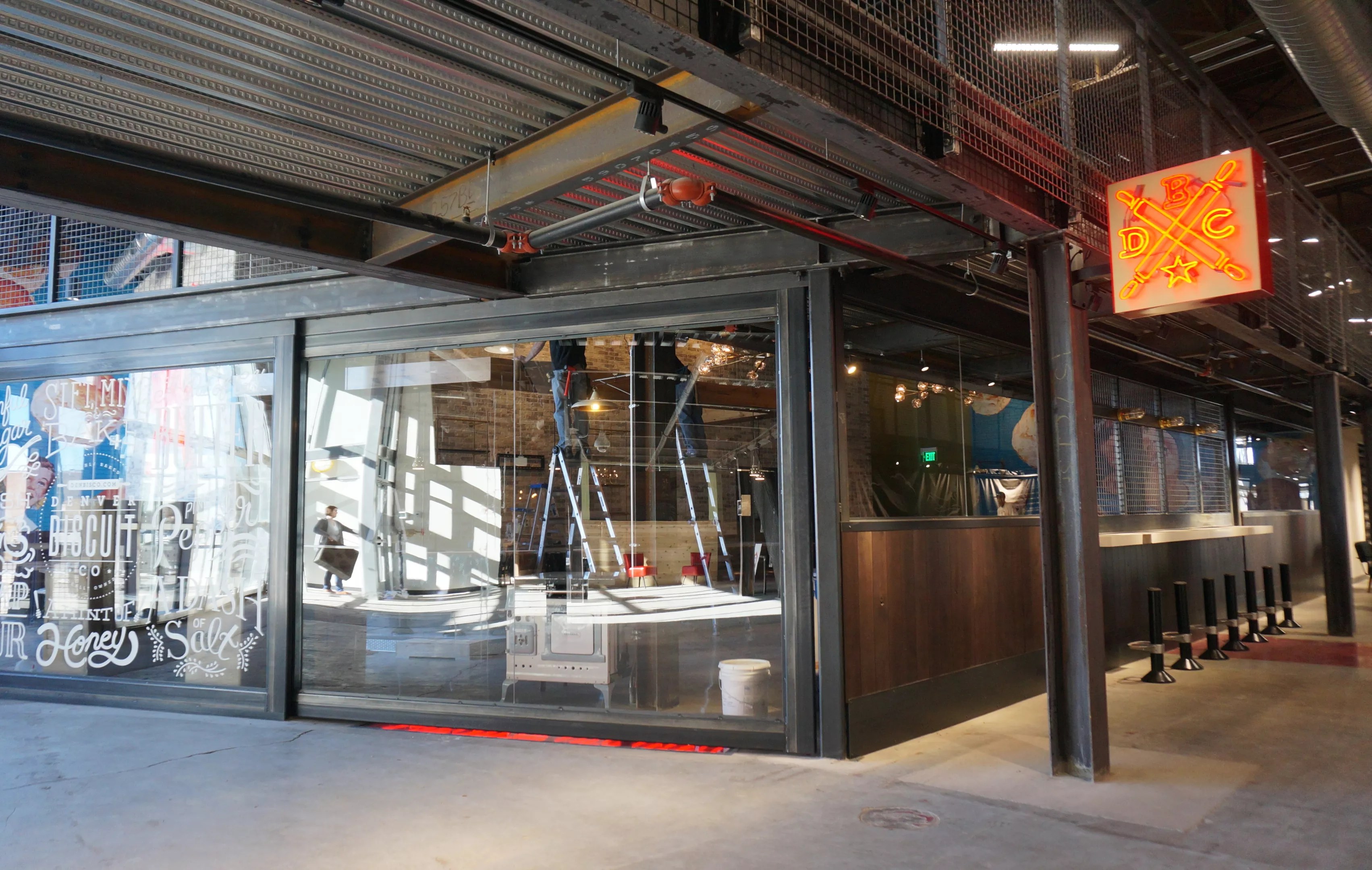 In the southeast corner of the building, the Denver Biscuit Company is getting ready to open its fourth all-day breakfast joint, after the original Atomic Cowboy on East Colfax, the second on South Broadway and the newest on Tennyson Street. The Stanley version of the restaurant lacks the Atomic Cowboy brand and the Fat Sully’s Pizza component and will focus instead on breakfast and lunch – but with plenty of beer and cocktails, too. A small patio faces an outdoor plaza, and counter seating along the interior promenade affords a view into the restaurant while keeping customers in the flow of the market. Of course, there’s bar seating and tables inside the restaurant, too, which is almost entirely encased in glass walls for an open, airy environment that extends into the second-floor space with vaulted ceilings. The Denver Biscuit Company is now hiring and is expected to open in the next month.