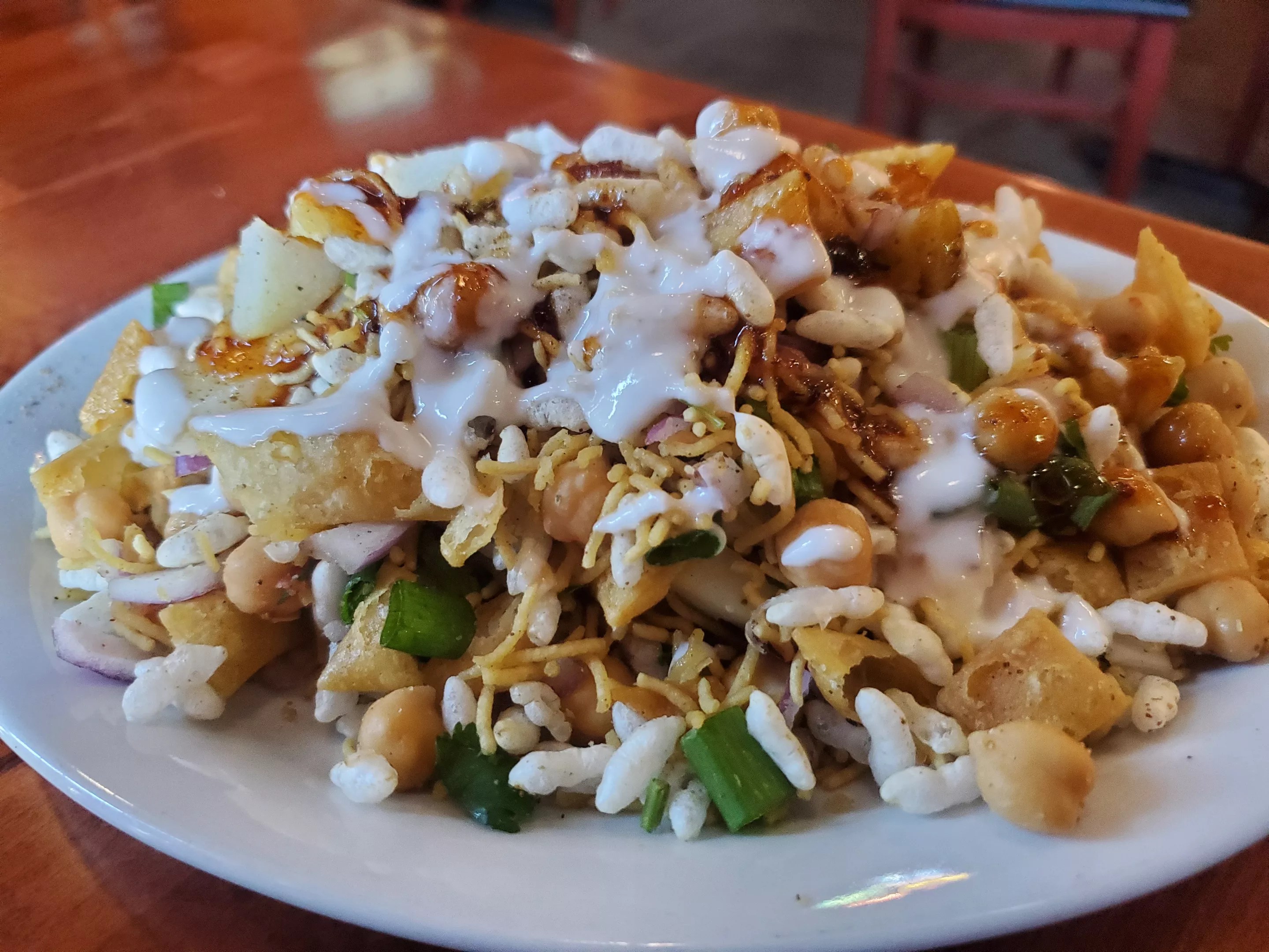 On the other hand, items from the Indian Street Chaat section of the menu are best enjoyed on site, because many of them include crunchy elements. On a server’s recommendation, I ordered the Bombay bhel ($7), a tangle of puffed rice, fried vermicelli, chickpeas, diced red onion, green onion and herbs topped with a tangy tamarind sauce and a creamy yogurt sauce. The mix of textures and flavors makes for a supremely satisfying snack that pairs well with a cold beer or a mango lassi.