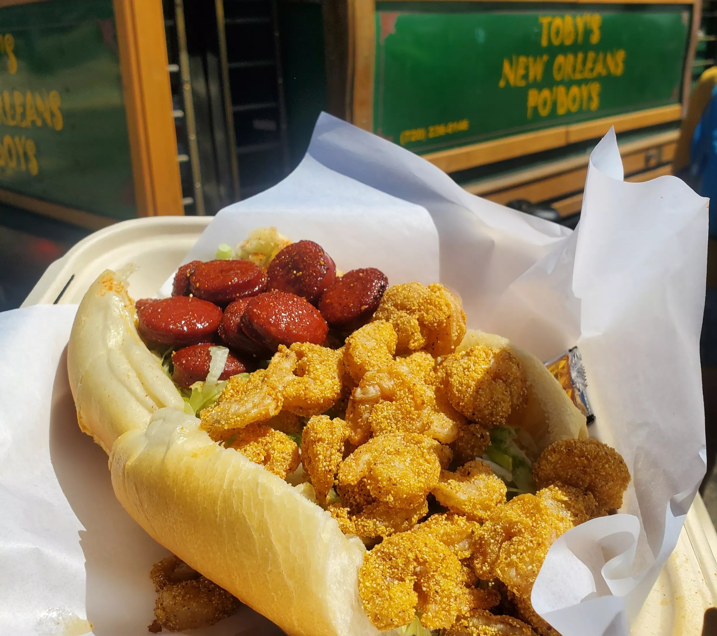 A half shrimp, half hot link po’boy from Toby’s is big enough to share — if you want to.