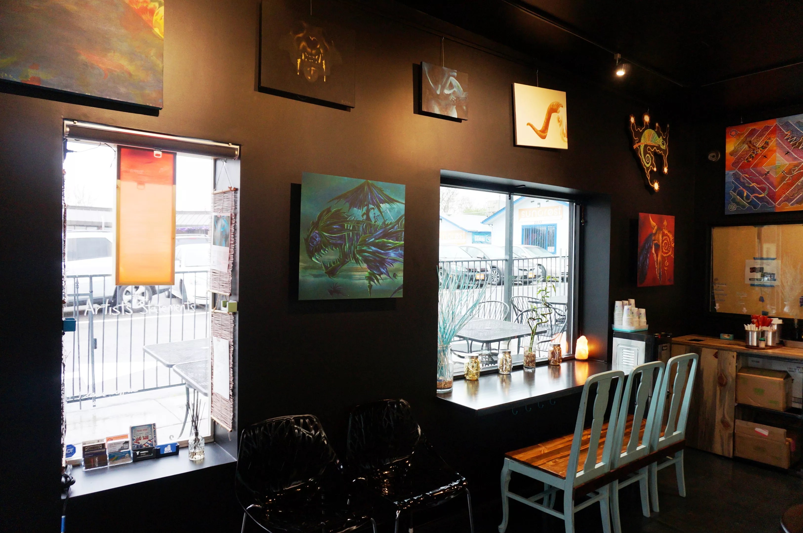 The local theme carries through to nearly every design element in the tiny dining area. “People take a lot of pride in living in Colorado,” Song explains, “so we want to use as many Colorado products as possible.” Some of the furnishings were built by local shops like Purpose & Pine, and the high-tech speakers built by the Sound Wall are covered in magnetic skins with art from Vinie Botello, who also painted the exterior murals, along with several other Denver artists.