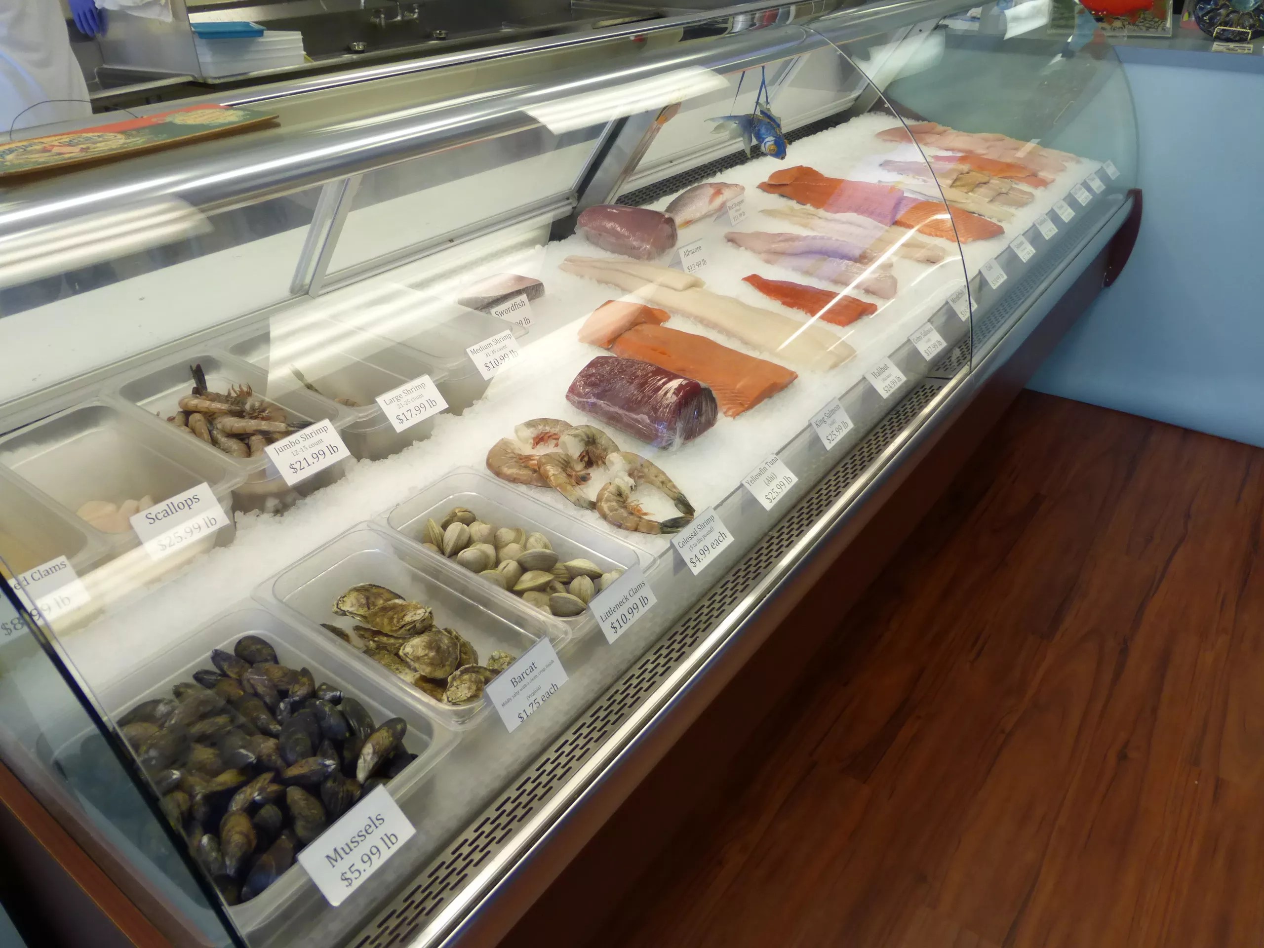One of their first orders of business was to remodel and redecorate the store, which now includes a large-screen monitor showing customers a list of products not visible in the fresh case. The store also sells a bevy of pantry items and other packaged goods, many of which are locally made, that enhance the fresh-seafood selection.