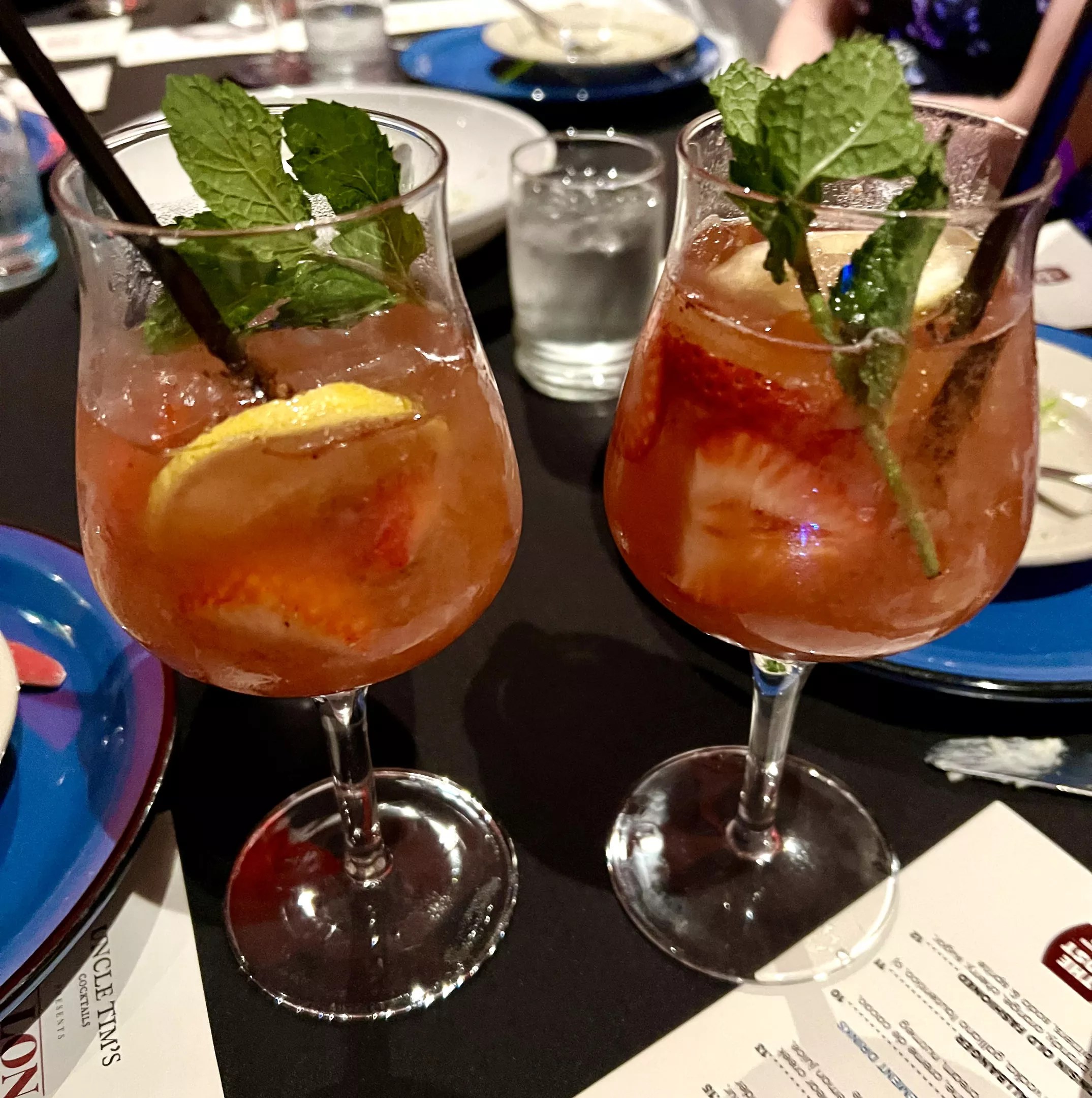 The Buffalo Spritz, made with Uncle Tim’s Cocktails Classic Negroni, strawberries and prosecco.