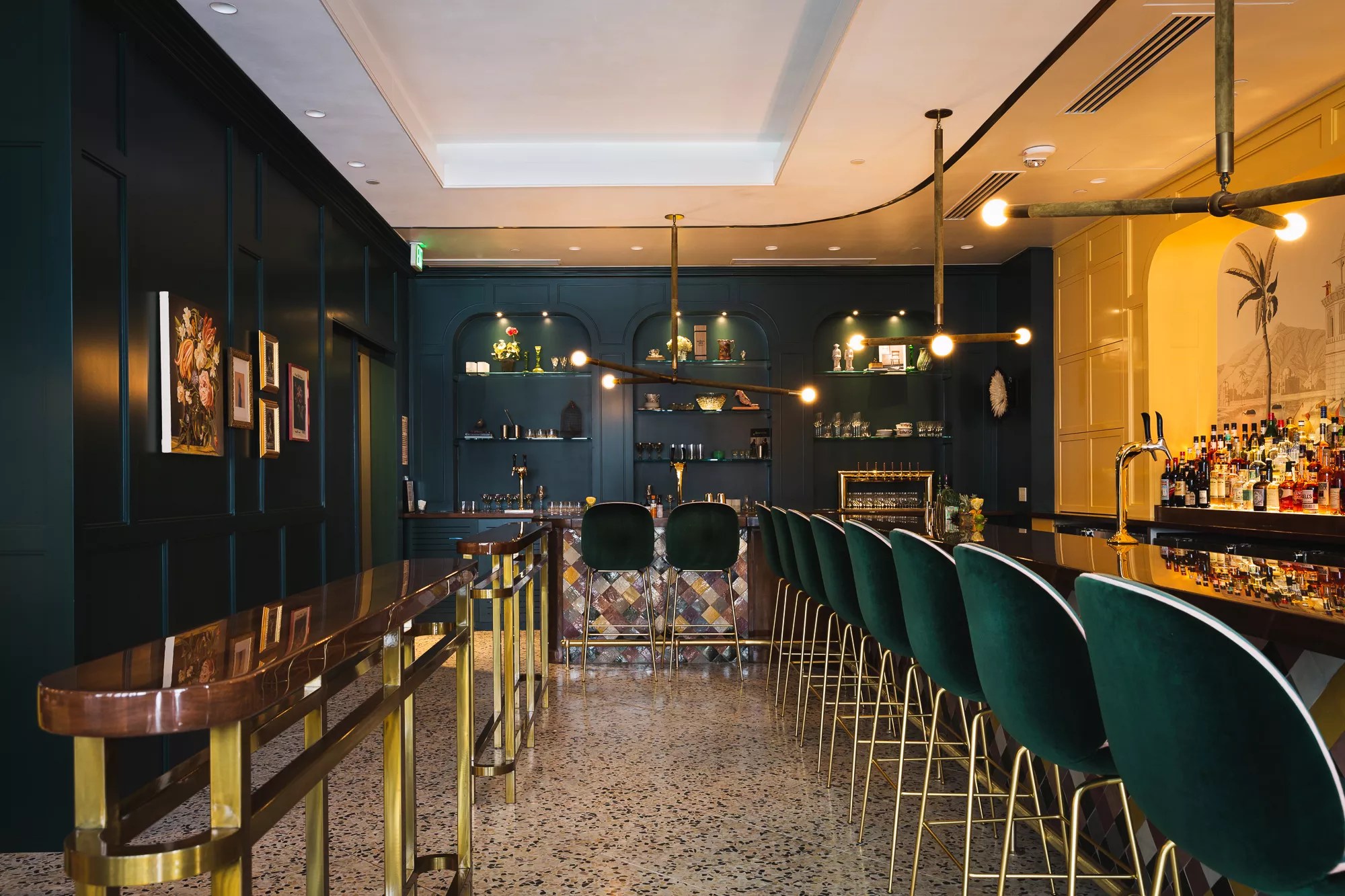 The new cocktail bar captures the spirit of the Roaring Twenties in both its design and its menu. Arnold says she and her team designed the space, with Semple Brown as the architect and Sprung Construction as the builder. Cushy olive-green banquettes, marble tabletops, copper-topped drink rails, oil paintings (curated by Kate Finds Art) and colorful wallpaper add to the feel of an explorer’s conservatory or library, and a hand-painted mural behind the long, wrap-around bar depicting palm trees, elephants, camels and temples adds a touch of Orientalism popular in European salons at the turn of the century.