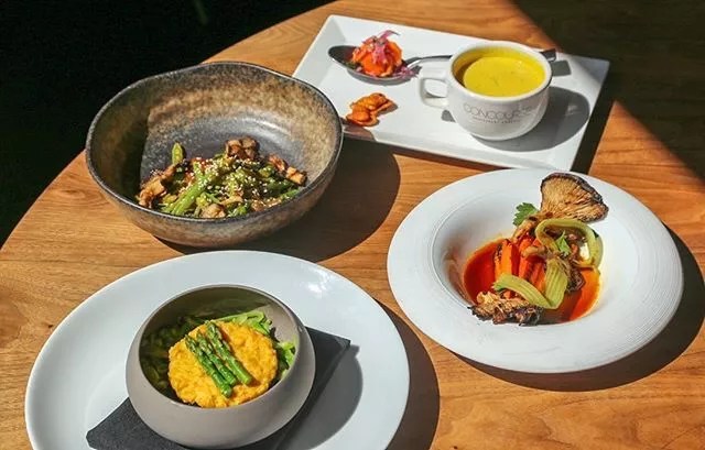 Saucy Bombay makes traditional Indian cuisine in a fast-casual setting. The Vegan Restaurant Week featured dish at Saucy Bombay is the Buddha Bowl, a mix of vegetables and garbanzo beans served with basmati rice, with your choice of tikka masala, korma, vindaloo, kadai, yellow lentil or spinach sauces. Any sauce, rice and veggie combo can be nestled in whole-wheat roti for an Indian burrito. Naan without butter and vegetable samosas are also vegan. Vegan goes upscale at Concourse. Concourse Restaurant