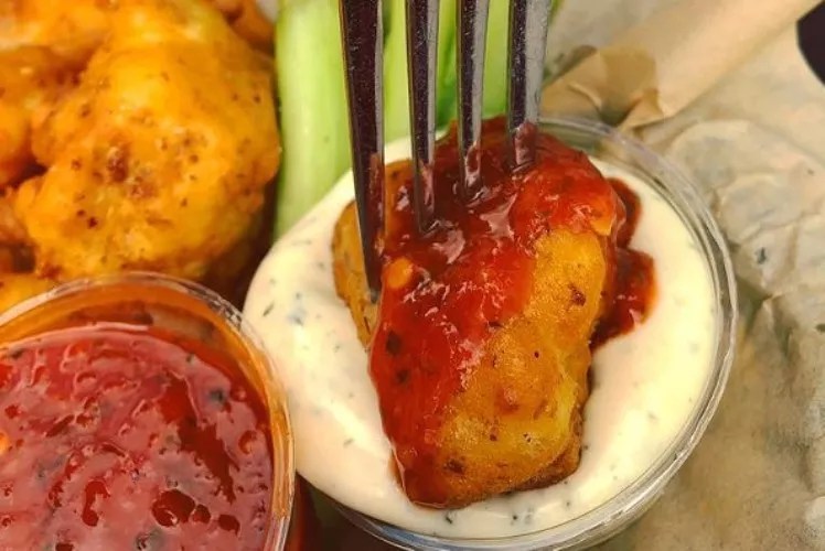 At Concourse, dine on a vegan four-course dinner for $35. Appetizers include maitake mushrooms and carrots grilled with yuzu, ponzu, celery curls and paprika oil; and pea soup with spiced coconut foam. Entrees include a choice of beluga lentil dal or char kway tao, made with tapioca noodles, mushroom, asparagus, snow peas and haricots verts. Swap out the chicken wings for seitan or cauliflower wings at Fire on the Mountain. Courtesy Fire on the Mountain