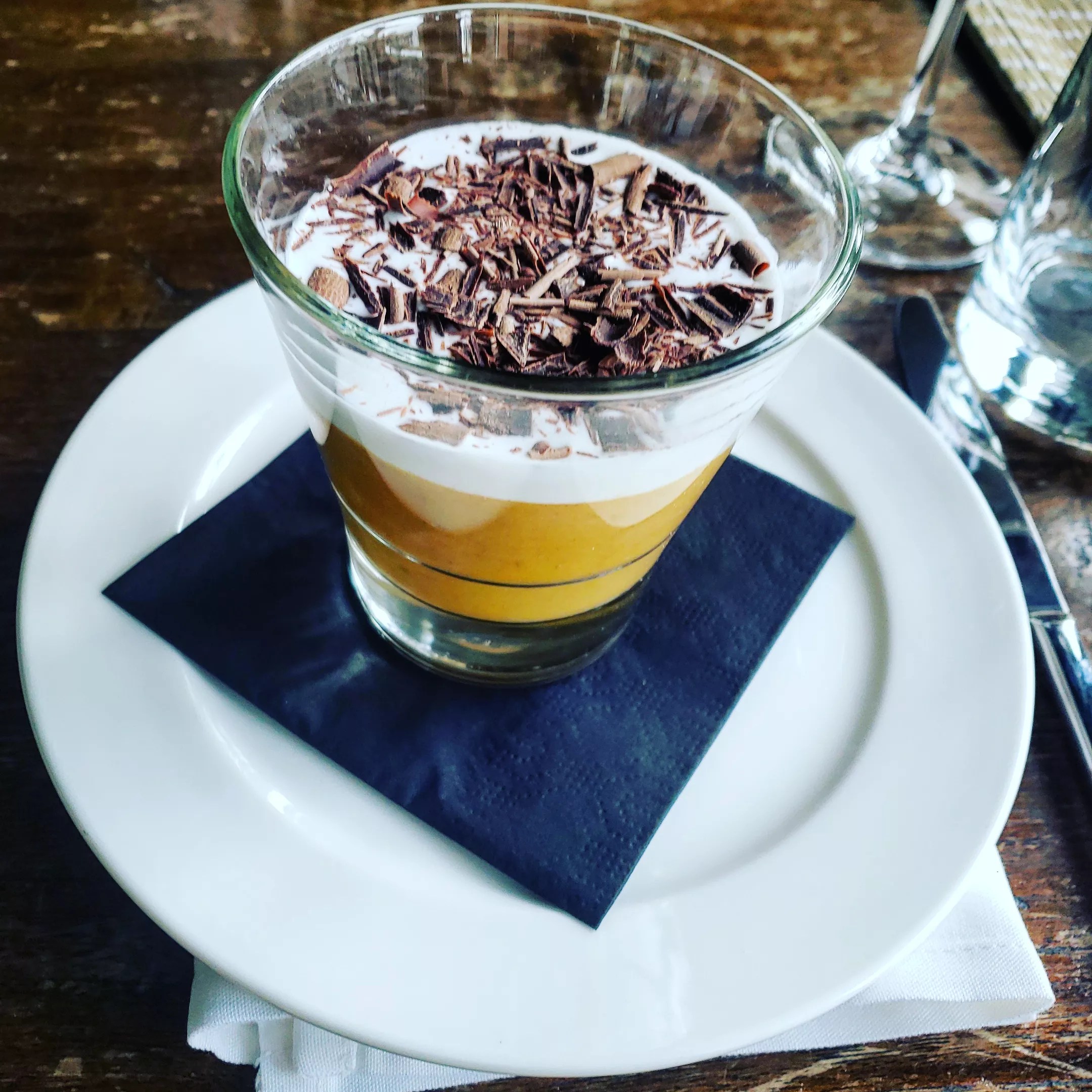 Coohills’ January options include root vegetable pavè; an orange and tofu purée with grilled broccolini, celery and celeriac chips; and, for dessert, pudding de courge musquee, a pudding made with sweet potato puree, coconut oil, spices and brown sugar, served with coconut whipped cream and vegan chocolate shavings.