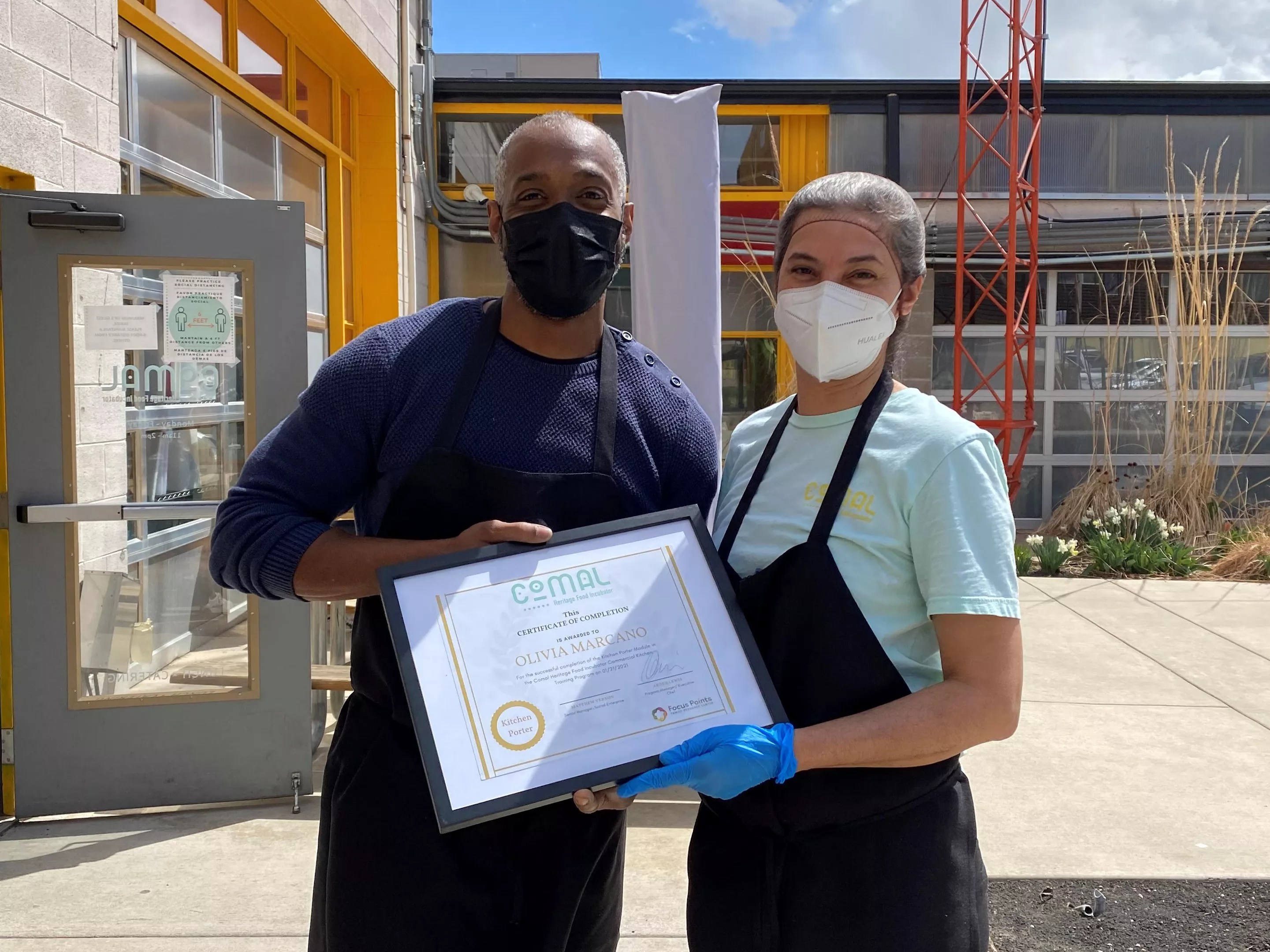 Olivia Marcano receives her certificate of completion from Comal’s executive chef, Arden Lewis.