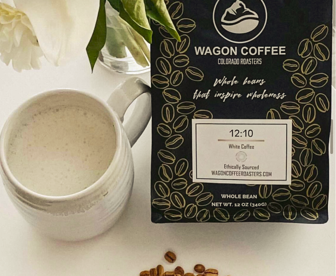 12:10 is a white coffee that has 70% more caffeine than standardly roasted beans.