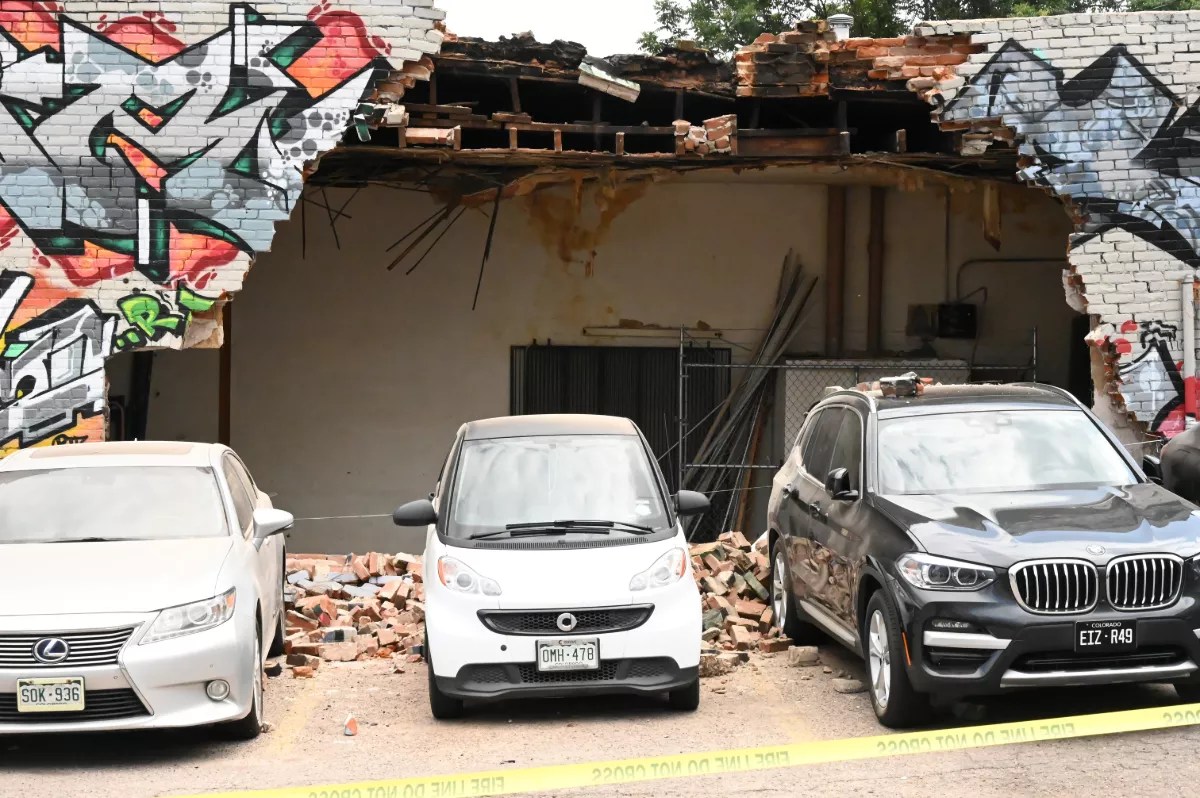 But now it faces another challenge: a gaping hole on its western side that’s twice as tall as the firefighters and Denver Police officers examining it. Firefighters at the scene say that no one was injured by the collapse, but a few cars parked nearby were hit with debris. The wall fell around 11 a.m., firefighters say.