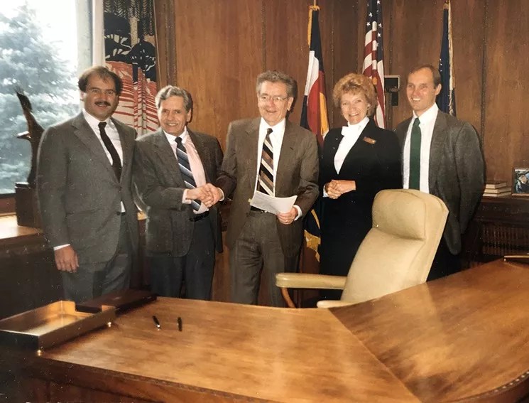 “Leap Day Weekend Shakeup: Three Breweries Open and Three Close” Joe Benetka (from left), Don Sandoval, Governor Roy Romer, Margaret Masson and Bart Bonsall were all there when brewpub law was made in 1988. Courtesy of Joe Benetka