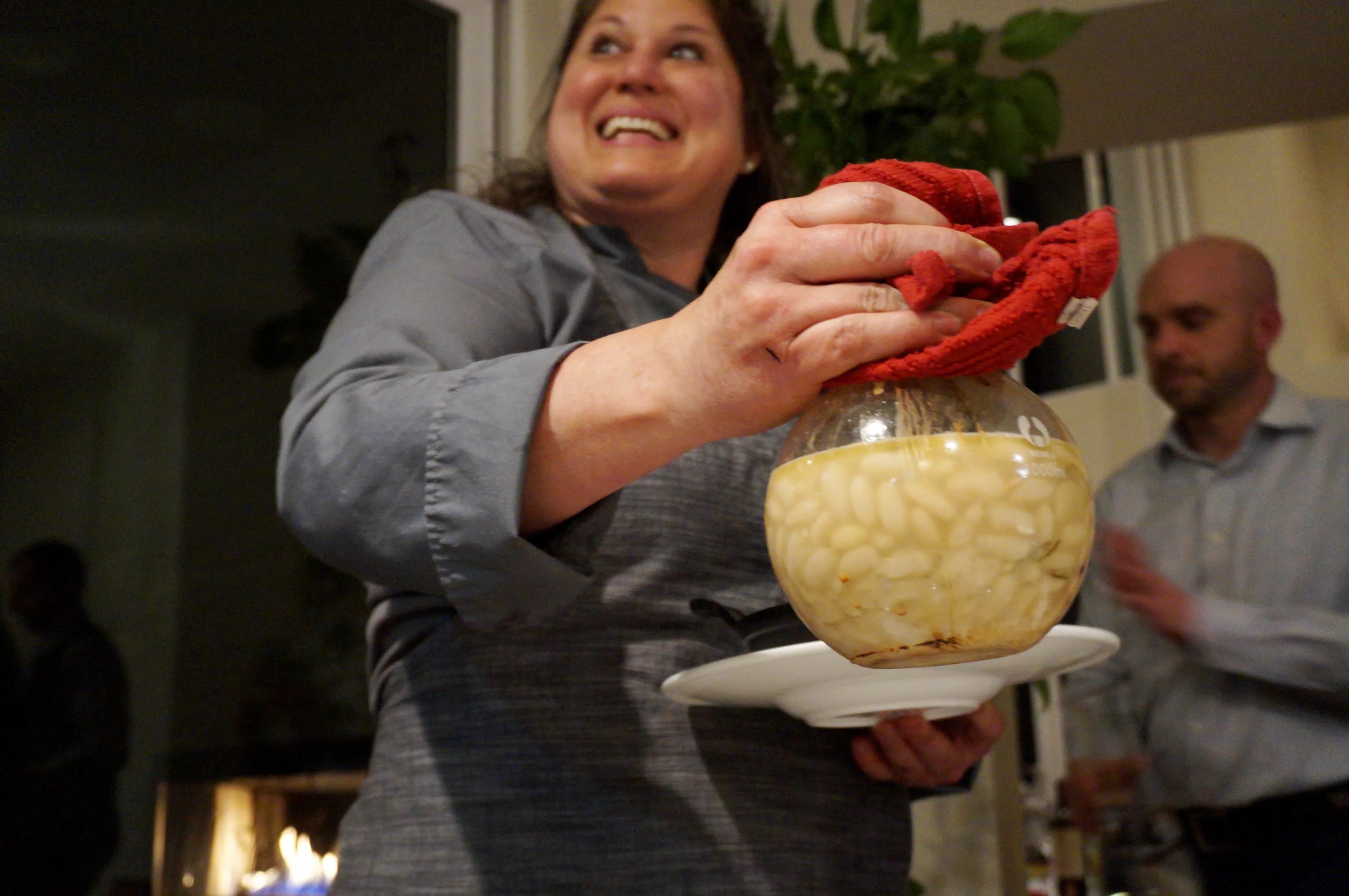 Chef Elise Wiggins serves fagioli al fiasco straight from the glass cooking vessel. This dish was traditionally cooked in chianti bottles.