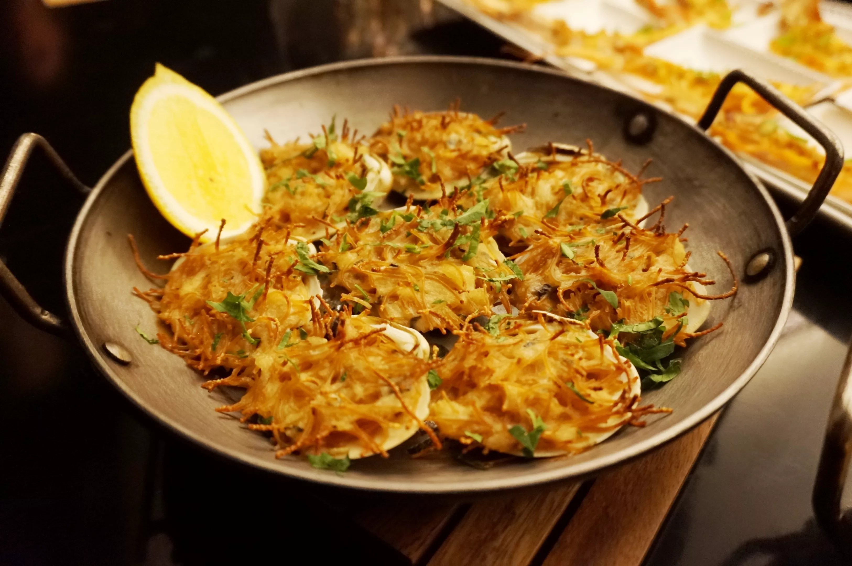 The house clams, topped with baked angel-hair pasta.