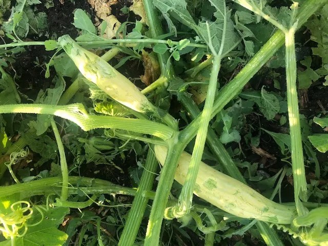 Squash plants regenerating after hail damage at ACRES at Warren Tech.