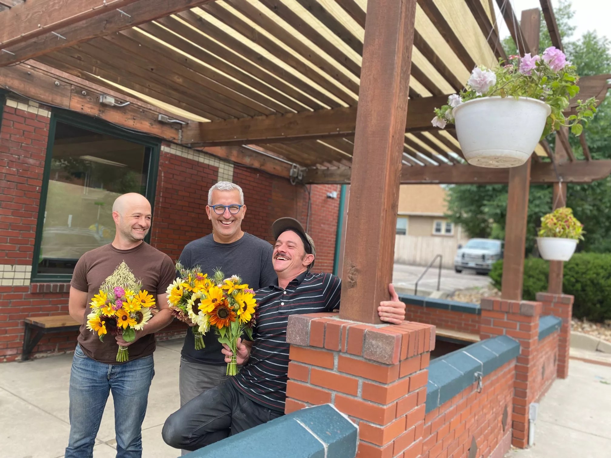 The owners hold flowers from Cure Organic Farm in Boulder, where Denn Phelps currently works.
