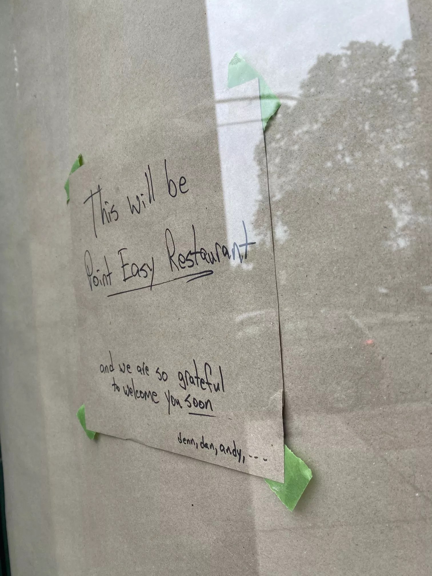 Since that brown paper went up in the windows, neighbors have begun asking questions about the project. Denn has taken to leaving little notes on the paper covering the front door, relaying messages to the neighborhood. Most are thoughts that he wants to share with curious neighbors, but on a Monday in August, the note was pretty direct: “This will be Point Easy Restaurant, and we are so grateful to welcome you soon.”