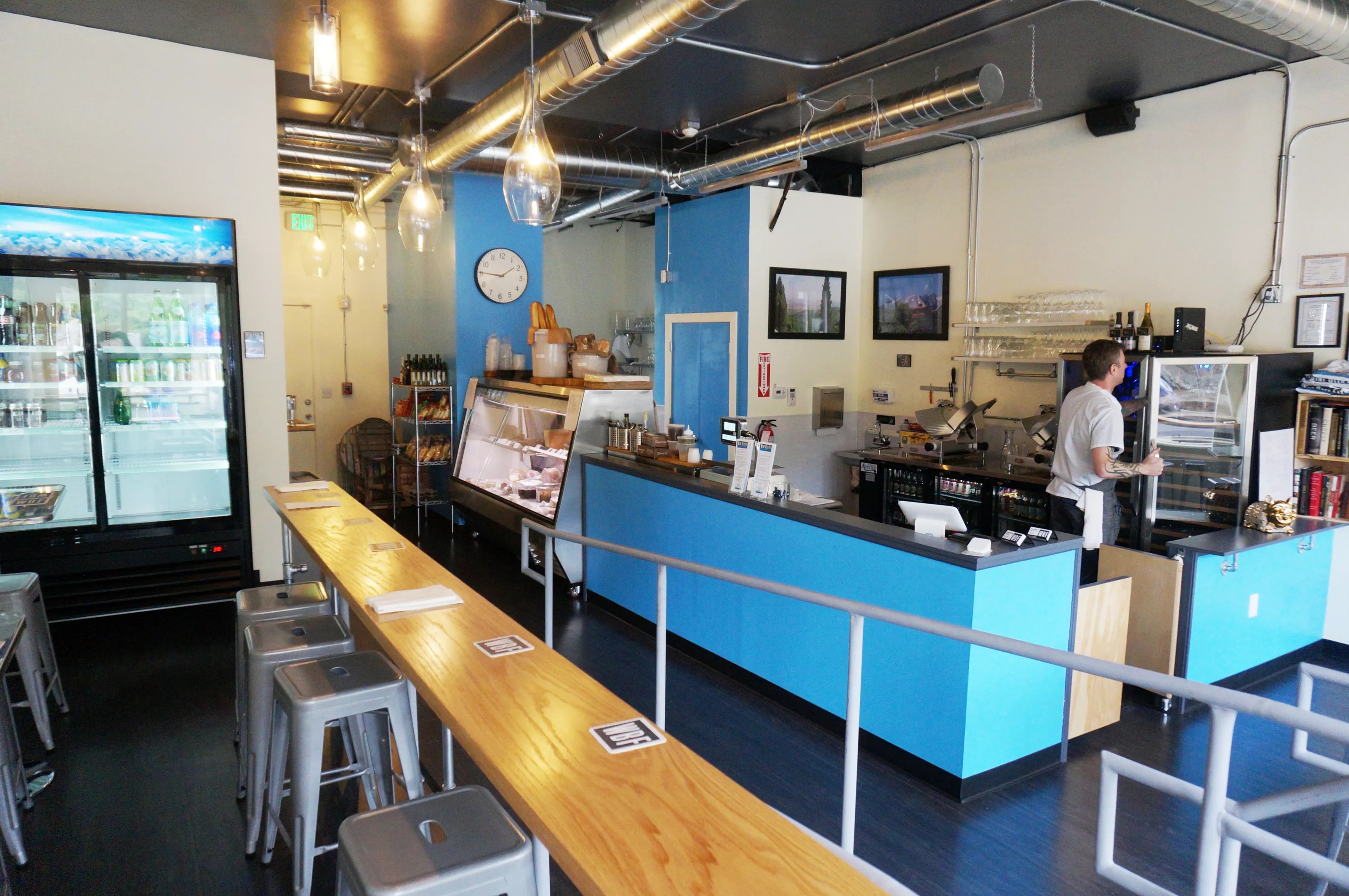 The menu at Wine Beer Fat is small – just a few sandwiches and salads at lunchtime and tapas and montaditos (small open-faced sandwiches) for dinner. There are also meat and cheese boards, or customers can order from the deli case and make their own meal from Spanish and Italian cured meats, cheeses and other snacks. Bread for sandwiches and montaditos is either City Bakery baguettes or focaccia from Dolce Sicilia.