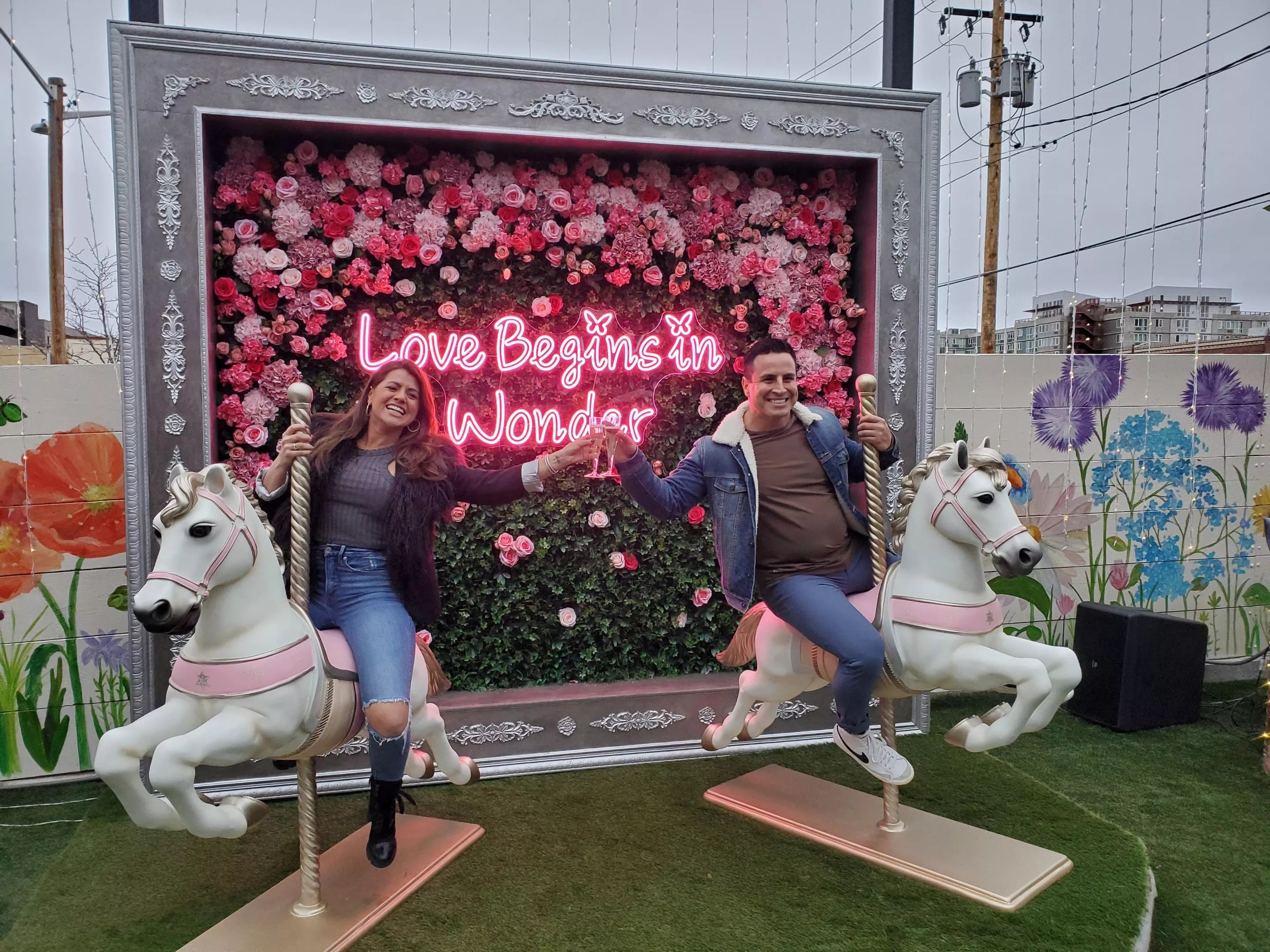 Wonderyard Garden + Table is now open at 2200 Larimer Street, in a long-vacant 100-year-old building. Inspired by The Great Gatsby and The Secret Garden with a touch of Alice in Wonderland, Wonderyard has a spacious interior complete with a large bar, DJ booth and quirky decor. The star of this show, though, is the sprawling outdoor space filled with couches, fire pits, string lights, teacup-shaped booths and – of course – a neon sign in front of a floral wall. This one says “Love begins in wonder,” and guests can pose in front of it while perched on carousel horses.