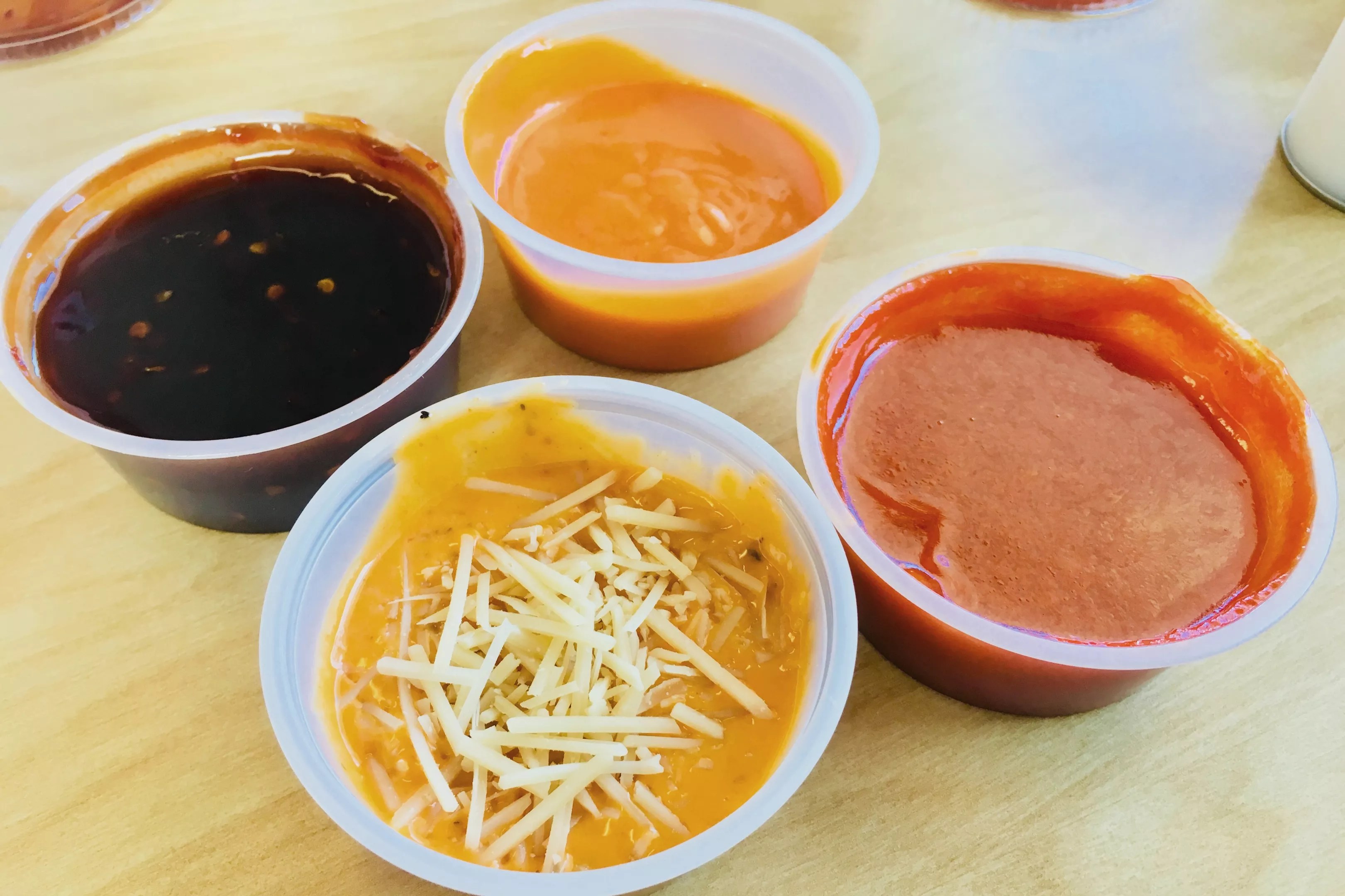 I also sampled five of the eleven non-Buffalo sauces (available for 89 cents per additional cup) to see how they measured up. While the variety was there, the honey sriracha, Spicyaki, zesty ranch, garlic Parmesan and honey barbecue simply tasted like a blend of two or more of the other sauces mixed together, or with different spice powders mixed in. The garlic Parmesan, for example, tasted like a mix of mild Buffalo sauce with garlic powder and ranch, though the shreds of real Parmesan were a bonus and added to the the texture of the creamy sauce. The honey barbecue stood out with notes of molasses, honey and heavy liquid smoke, but the Spicyaki seemed like a mix of teriyaki sauce and honey barbecue with a few red-pepper flakes. The honey sriracha was the least impressive (and also the most expensive at 99 cents per cup); it was vinegary, overpoweringly sweet and too thin to cling to the wings. Those sauces tend to add up. Maureen Witten