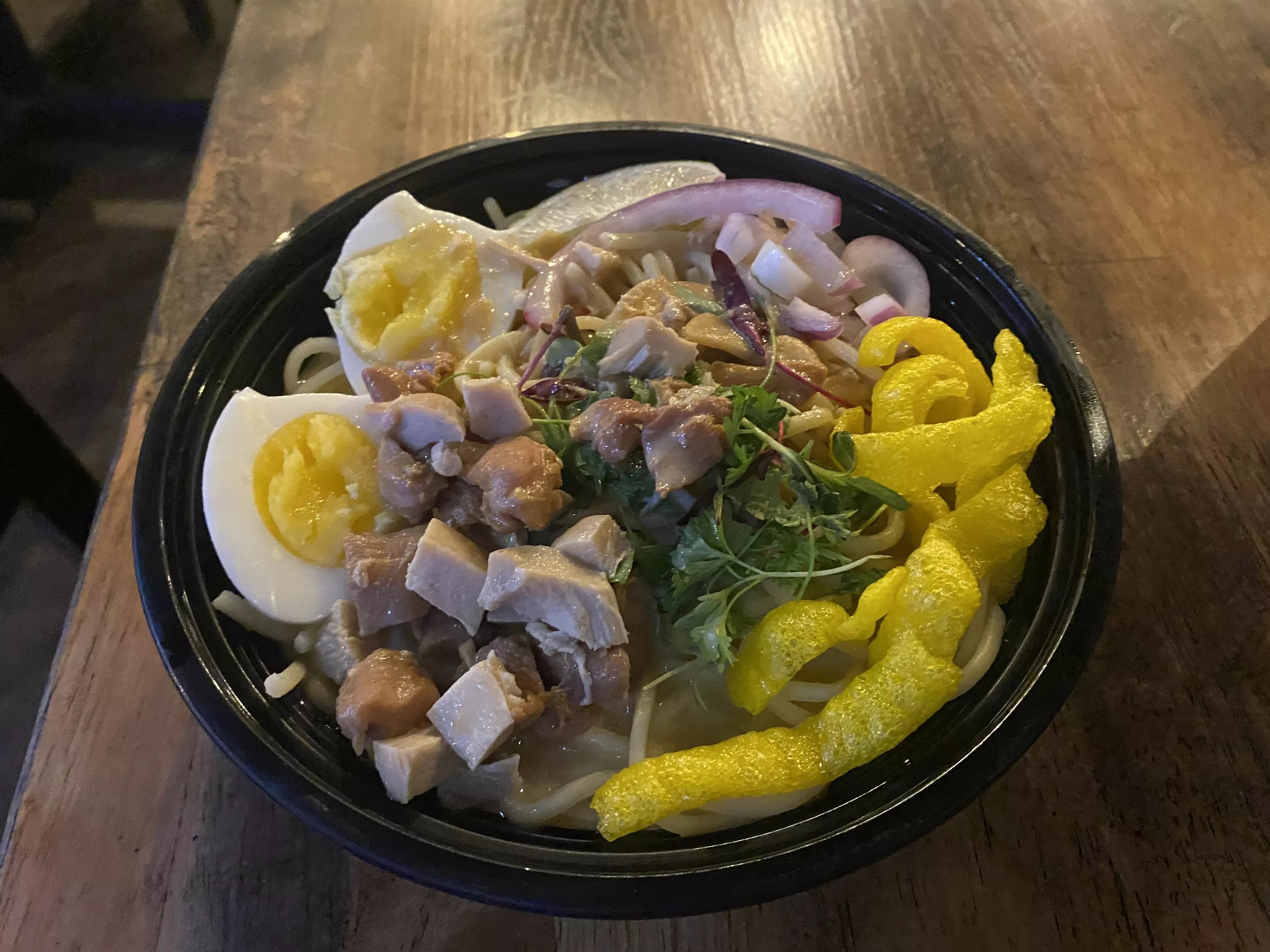 Ohn no khao swè, a type of coconut curry, comes with chicken, soft noodles, egg, rice puffs, herbs, onion and lime.