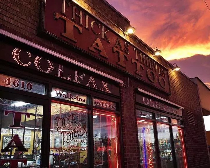 Thick as Thieves Tattoo Neighborhood: East Denver 4610 E. Colfax Ave., CO, 80220 Map It 303-321-8442 Website Best Of Denver® Awards 2018 Best Tattoo Shop for Walk-Ins Courtesy Thick as Thieves Facebook page advertisement Related Articles No Image Denver Life Top five interviews with Denver tattoo artists By Nathalia Vélez No Image Denver Life Jeremy Barber on biker shops, tradition and tattoo education By Nathalia Vélez No Image Denver Life Lorenzo Baca on Albuquerque, graffiti and being a perfectionist By Nathalia Vélez No Image Denver Life Sam Kuhn on graphic design, sleeping in, and Disney movies as tattoo inspiration By Nathalia Vélez advertisement Trending Concerts John Legend Brings Soulful Magic to the Paramount: Photos By Brandon Johnson Health Mosquitos, Kissing Bugs Bring New Disease By Michael Roberts Restaurants Where to Get Thanksgiving Dinner To Go in Denver By Abigail Bliss Denver Life Denver Arts & Venues Dishes Out the Data Behind Denver Creates By Kristen Fiore