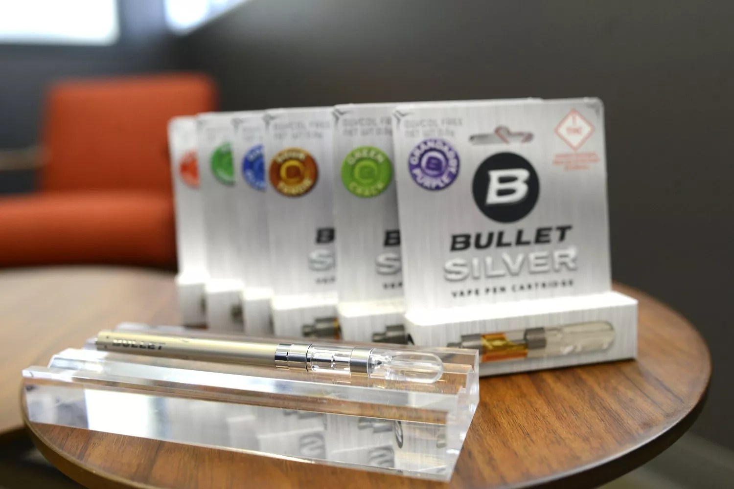 Vaporizer cartridges filled with THC distillate, like these Bullet Silvers, are quickly trending upward in Colorado.