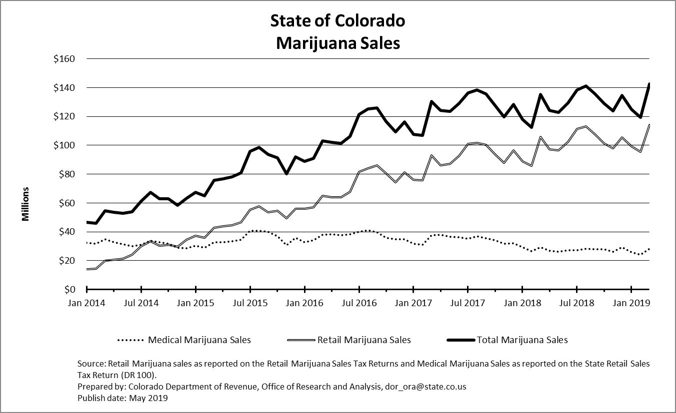 According to the state Department of Revenue, legal marijuana products totaling over $142.4 million were sold in March, with recreational pot responsible for the bulk of that. Both recreational and overall sales set records for a single month, beating out the next-highest month, August 2018, by a little over $1 million.