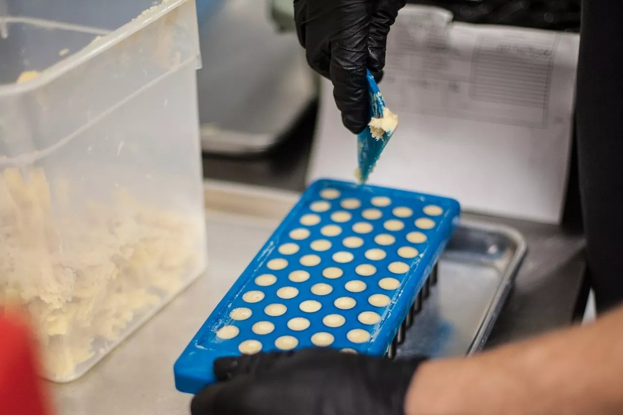 Cannabinoid-infused lip balm is molded into a casing at Veritas Farms.