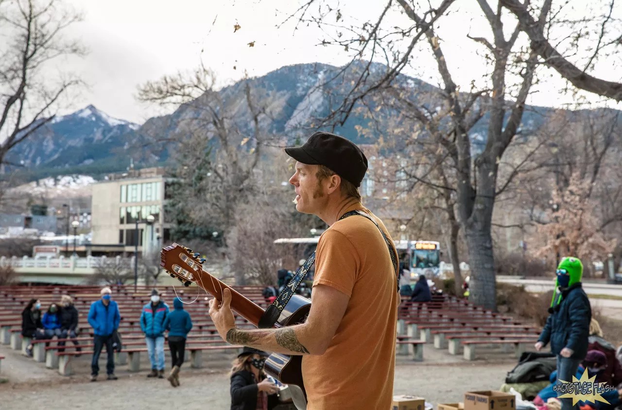 Clay Rose of Gasoline Lollipops performing a benefit for the homeless as part of his Tuesday series at the Boulder Bandshell.