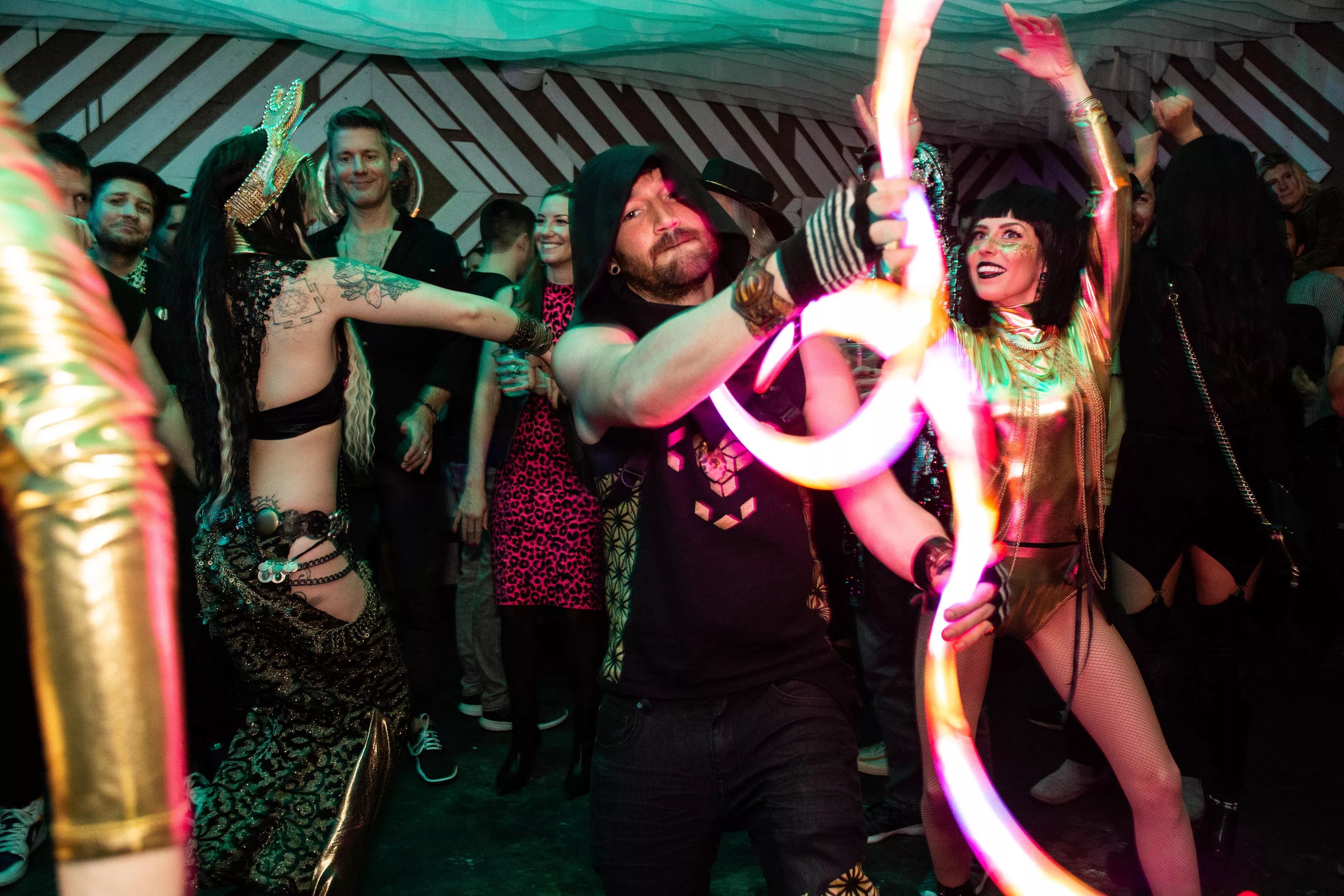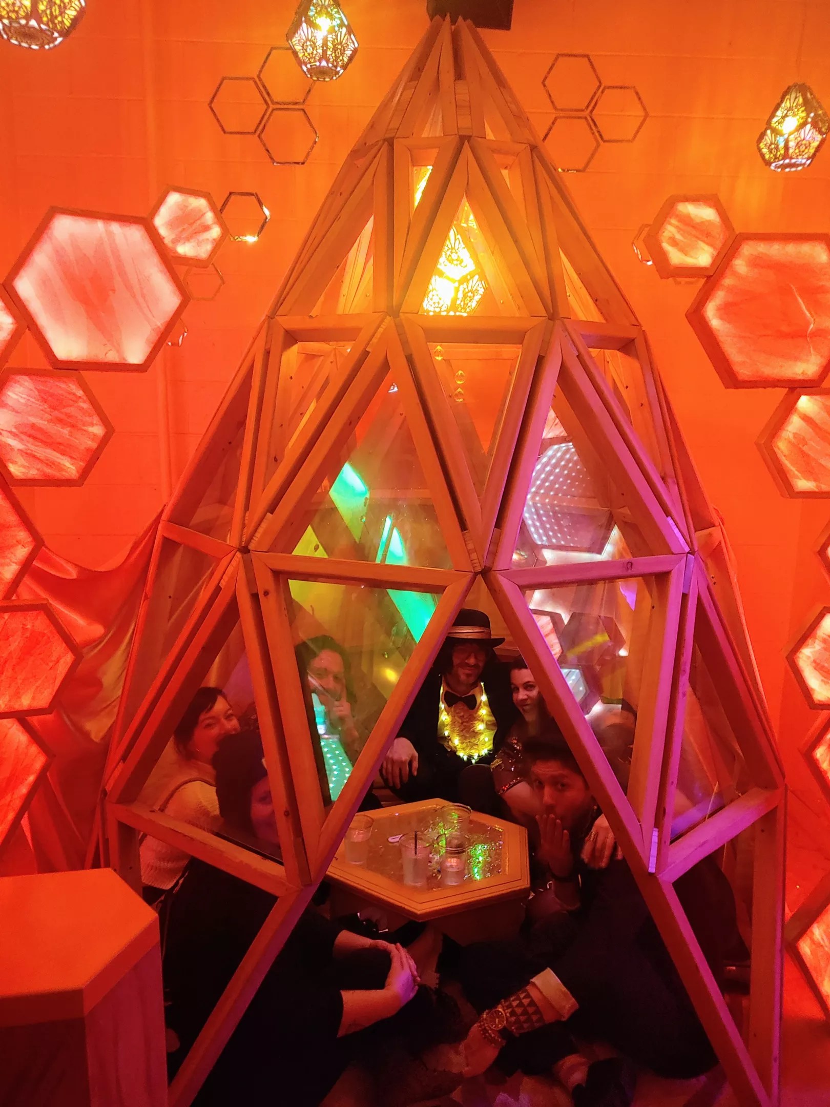 The Beacon also features multiple chill-out rooms made from different artists’ immersive works. The one that drew me was “Enter the Hive Mind,” a bee-hive themed take on a geodesic dome by Aleesha Anderson. I invited myself into the crowd that was sitting in there, asking if I could take a quick photo of them. Instead, I was quickly drawn in by the eccentricities of the people sitting within it.